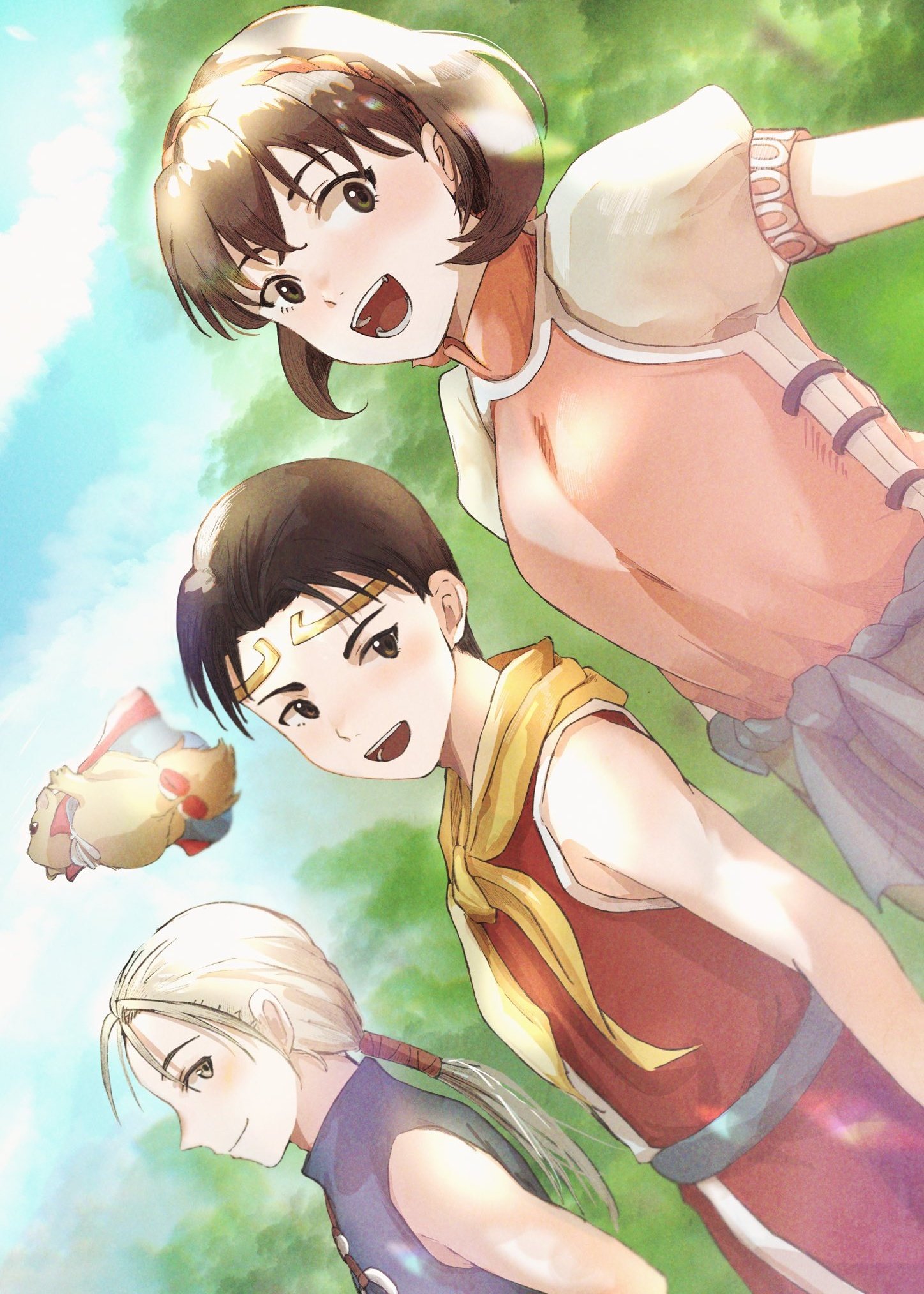 1girl 3boys breasts brown_eyes brown_hair cape circlet closed_mouth cloud gensou_suikoden gensou_suikoden_ii hairband highres jowy_atreides-blight korunosabu looking_at_viewer medium_breasts mukumuku multiple_boys nanami_(suikoden) open_mouth riou_(suikoden) shirt short_hair smile