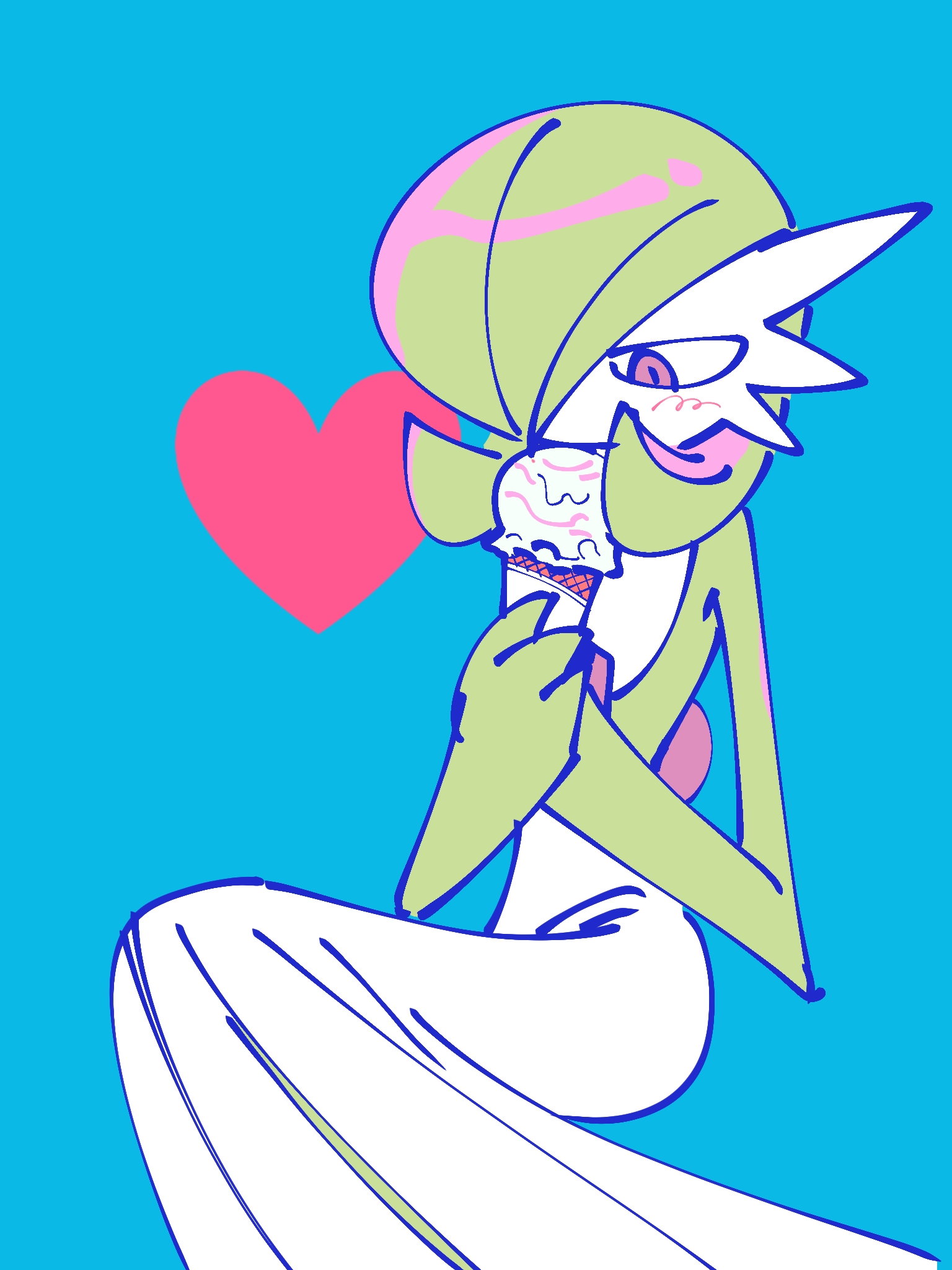 1girl 4shiki blue_background blush bob_cut colored_skin eating female_focus flat_chest food gardevoir gen_3_pokemon green_hair green_skin hair_over_one_eye half-closed_eyes hands_up heart highres holding holding_food ice_cream ice_cream_cone light_blush looking_down multicolored_skin nintendo one_eye_covered own_hands_together pokemon pokemon_(creature) red_eyes short_hair simple_background sitting sketch solo two-tone_skin white_skin