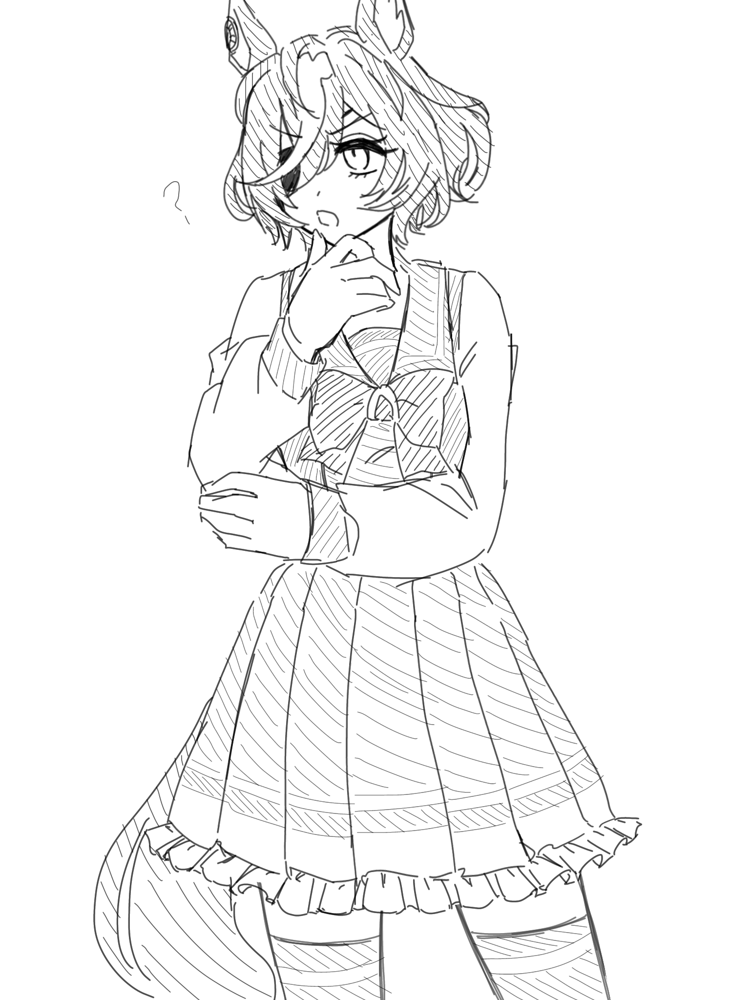 1girl ? animal_ears blush bow eyepatch frilled_skirt frills greyscale hair_between_eyes hand_up hide_oo highres horse_ears horse_girl horse_tail long_sleeves monochrome multicolored_hair open_mouth pleated_skirt school_uniform shirt skirt sleeves_past_wrists solo tail tanino_gimlet_(umamusume) thighhighs tracen_school_uniform two-tone_hair umamusume v-shaped_eyebrows