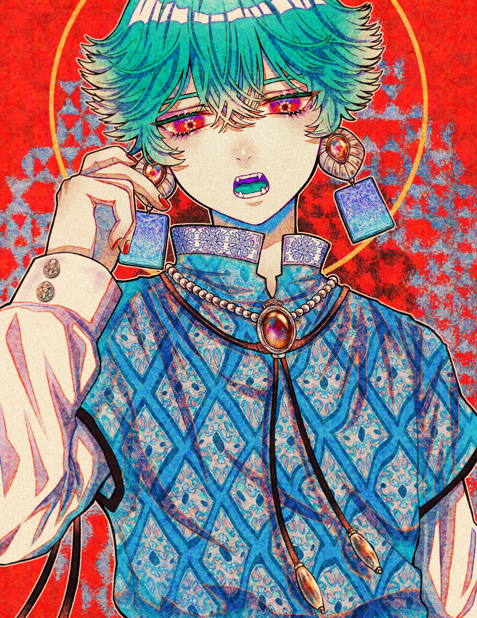 1boy absurdres akari_botan androgynous aqua_hair aqua_tongue arm_at_side bead_necklace beads colored_tips earrings fangs gem hair_between_eyes halo hand_up highres jewelry layered_sleeves long_sleeves looking_at_viewer male_focus multicolored_hair nail_polish necklace open_mouth original red_background red_eyes red_gem red_nails short_hair short_over_long_sleeves short_sleeves solo streaked_hair symbol-shaped_pupils upper_body white_hair