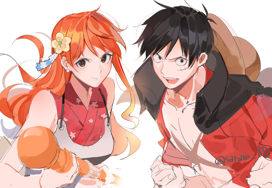 1boy 1girl armor bare_pectorals bare_shoulders black_eyes black_hair clenched_hands coat coat_on_shoulders couple flower hair_flower hair_ornament hat holding holding_weapon japanese_armor japanese_clothes joman kimono long_hair looking_at_viewer monkey_d._luffy nami_(one_piece) nami_(one_piece)_(onigashima) one_piece onigashima open_clothes open_shirt orange_eyes orange_hair pectorals red_shirt scar scar_on_chest scar_on_face shirt short_hair sketch sleeveless sleeveless_kimono smile straw_hat weapon