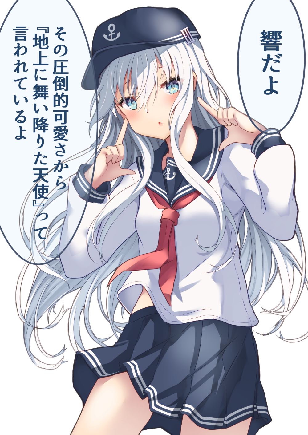 1girl anchor_ornament black_hat black_sailor_collar black_skirt blue_eyes commentary_request cowboy_shot flat_cap hat hibiki_(kancolle) highres kantai_collection long_hair looking_at_viewer natsu_narumi neckerchief pleated_skirt red_neckerchief sailor_collar school_uniform serafuku skirt solo standing translation_request white_hair