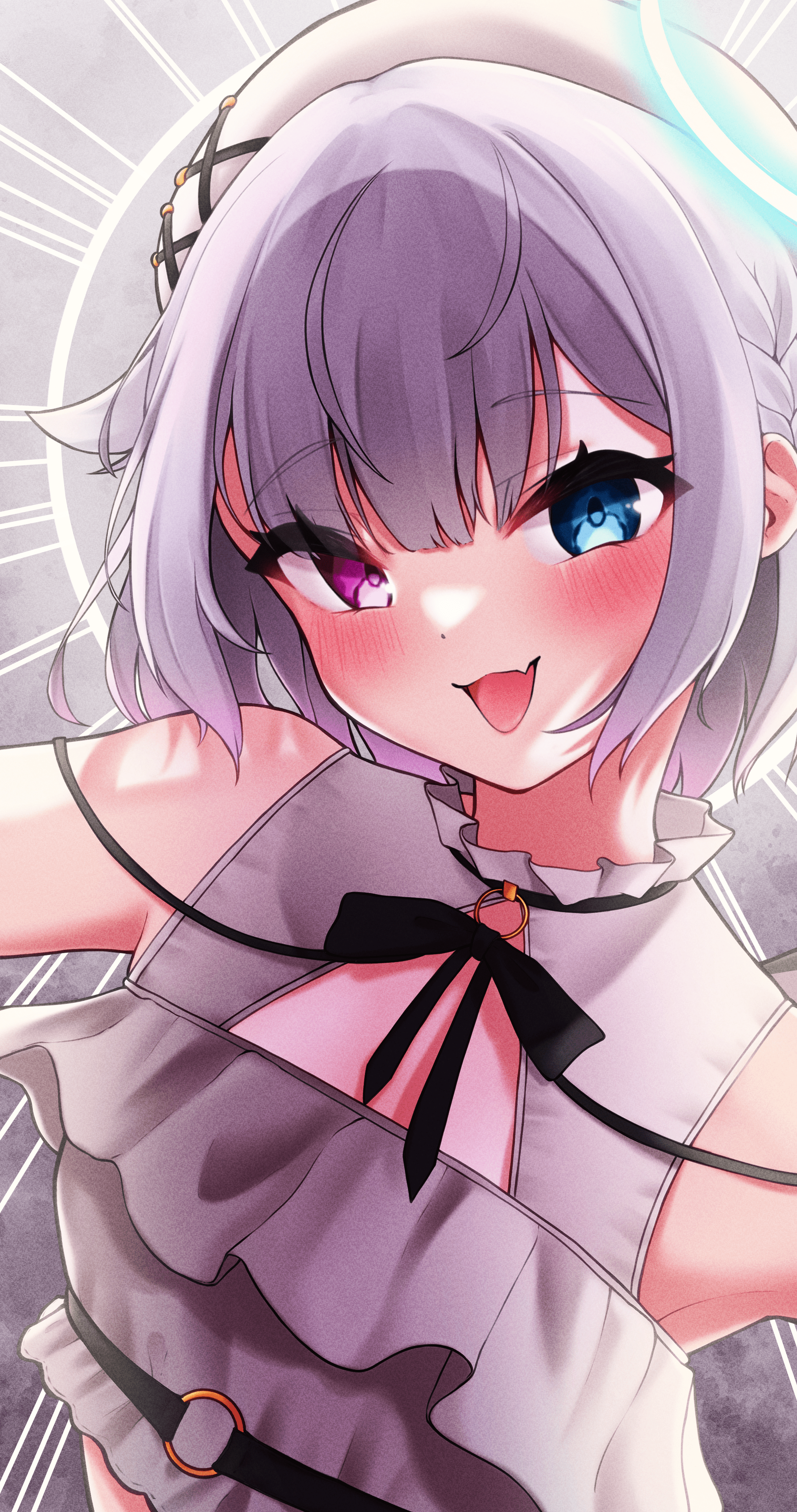 :d absurdres amemiya_nazuna amemiya_nazuna_(1st_costume) black_ribbon blue_eyes blush braid breasts cleavage_cutout clothing_cutout fang frilled_shirt frills hat heterochromia highres looking_at_viewer matcha_amigo open_mouth pink_eyes ribbon shirt short_hair single_braid skin_fang small_breasts smile virtual_youtuber vshojo white_hair white_hat white_shirt