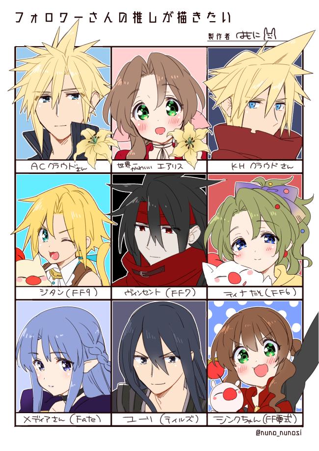 4girls 5boys :3 aerith_gainsborough aqua_background aqua_ribbon artist_name black_background black_choker black_hair black_jacket black_shirt blonde_hair blue_background blue_bow blue_eyes blue_hair border bow braid brown_hair cape character_name choker cinque_(fft-0) cloak cloud_strife collared_shirt dress fate_(series) final_fantasy final_fantasy_ix final_fantasy_type-0 final_fantasy_vi final_fantasy_vii final_fantasy_vii:_advent_children flower green_eyes green_hair hair_between_eyes hair_bow hair_ribbon headband high_collar jacket kingdom_hearts krudears lily_(flower) long_hair low_ponytail medea_(caster)_(fate) medea_(fate) meme moogle multiple_boys multiple_girls neckerchief open_collar open_mouth pale_skin parted_bangs pink_background pink_ribbon pointy_ears polka_dot polka_dot_background ponytail portrait purple_dress red_cloak red_eyes red_headband red_jacket red_neckerchief ribbon ribbon_choker shirt short_hair side_braid sidelocks smile spiked_hair square_enix tales_of_(series) tales_of_vesperia tina_branford torn_cloak torn_clothes vincent_valentine wavy_hair white_shirt yellow_cape yellow_flower yuri_lowell zidane_tribal