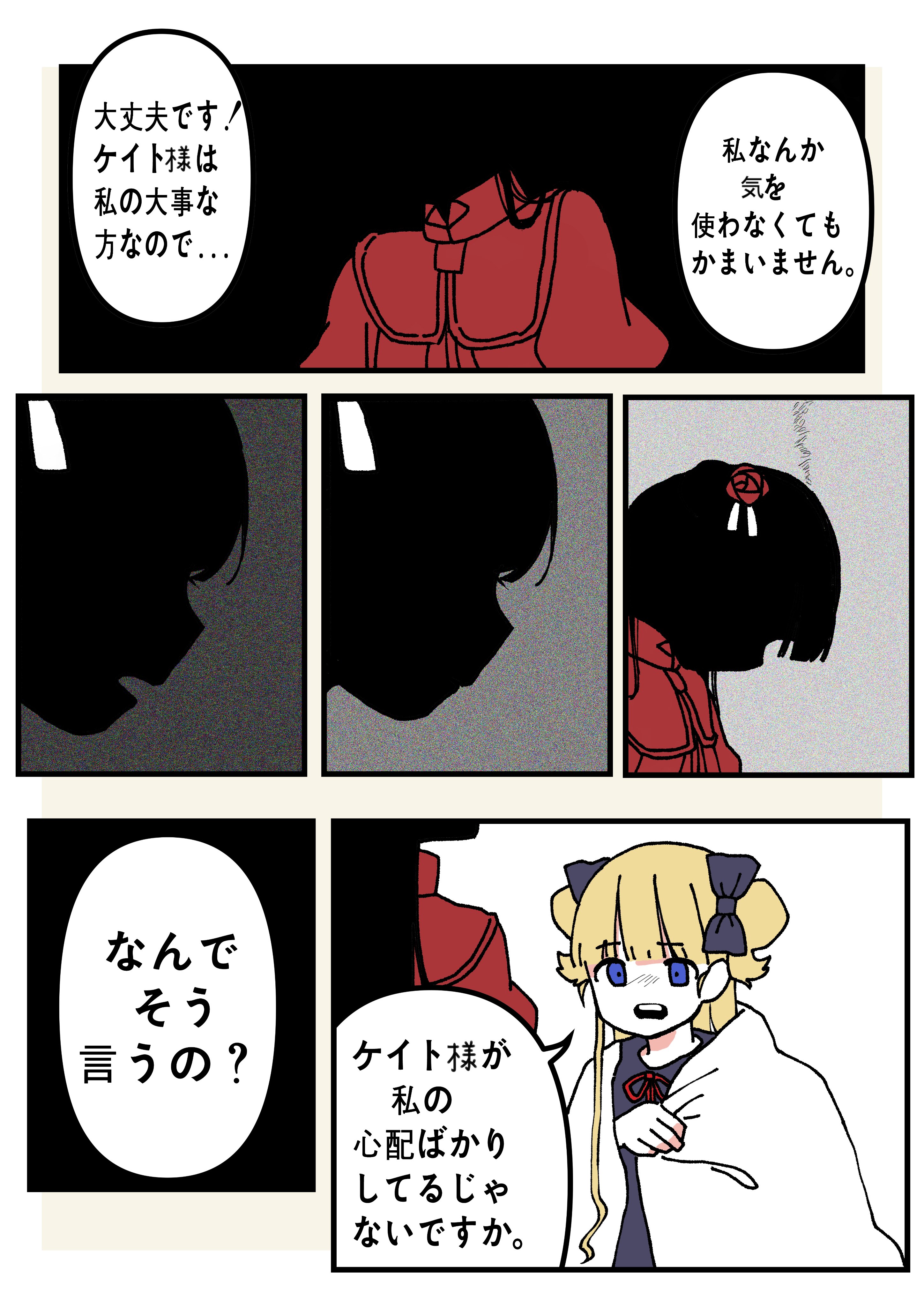 2girls absurdres blonde_hair blue_bow blue_dress blue_eyes blush bow comic covering_with_blanket dress emilico_(shadows_house) flower frilled_dress frills hair_bow hair_flower hair_ornament hair_ribbon highres hoi_plantmaster kate_(shadows_house) long_sleeves looking_at_another multiple_girls open_mouth red_dress red_flower red_rose ribbon rose shadow_(shadows_house) shadows_house soot speech_bubble translation_request two_side_up under_covers white_ribbon
