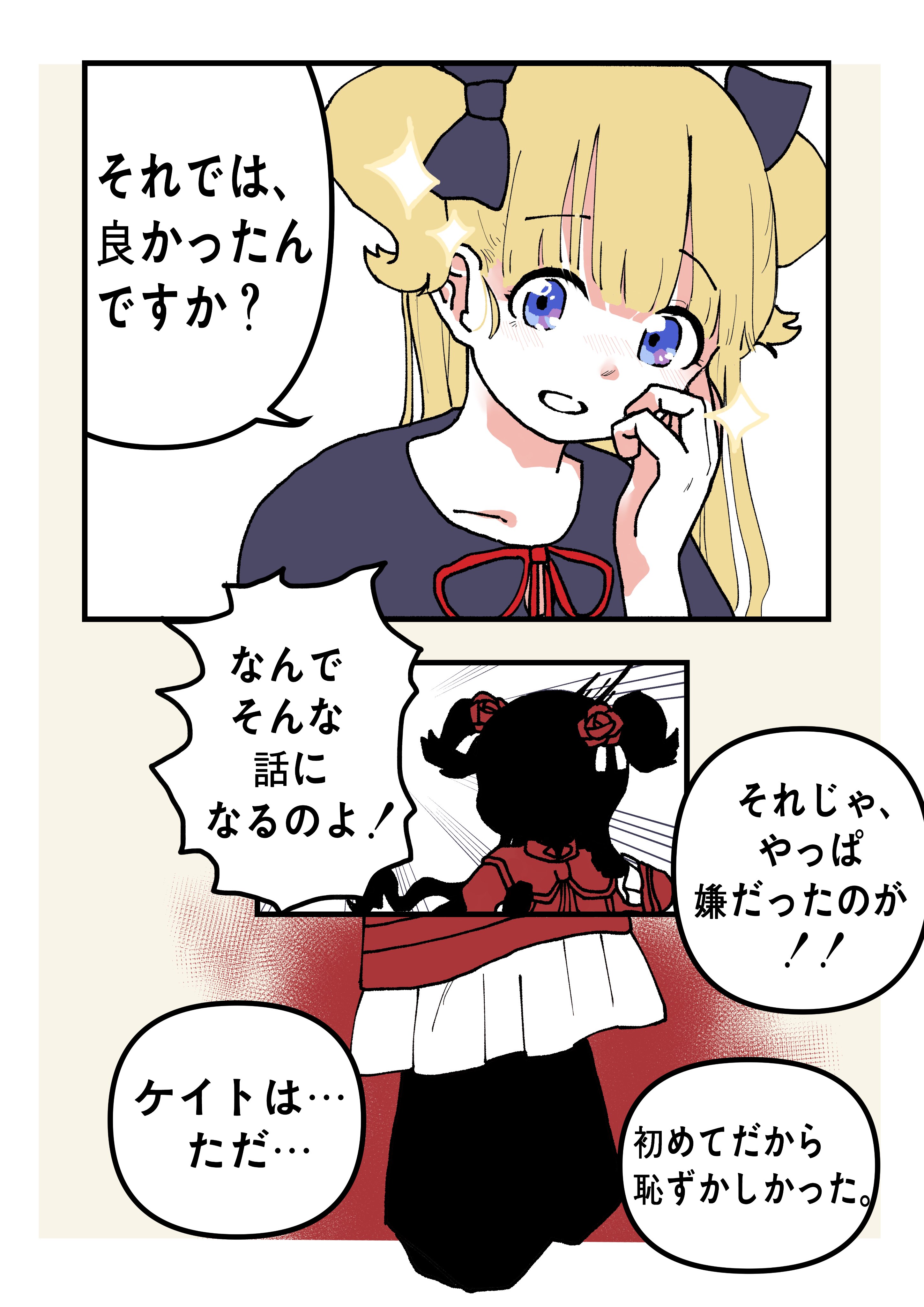 2girls absurdres blonde_hair blue_bow blue_dress blue_eyes blush bow comic dress emilico_(shadows_house) flower frilled_dress frills grin hair_bow hair_flower hair_ornament hair_ribbon highres hoi_plantmaster kate_(shadows_house) long_sleeves looking_at_another multiple_girls open_mouth red_dress red_flower red_rose ribbon rose shadow_(shadows_house) shadows_house smile sparkle speech_bubble translation_request two_side_up white_ribbon