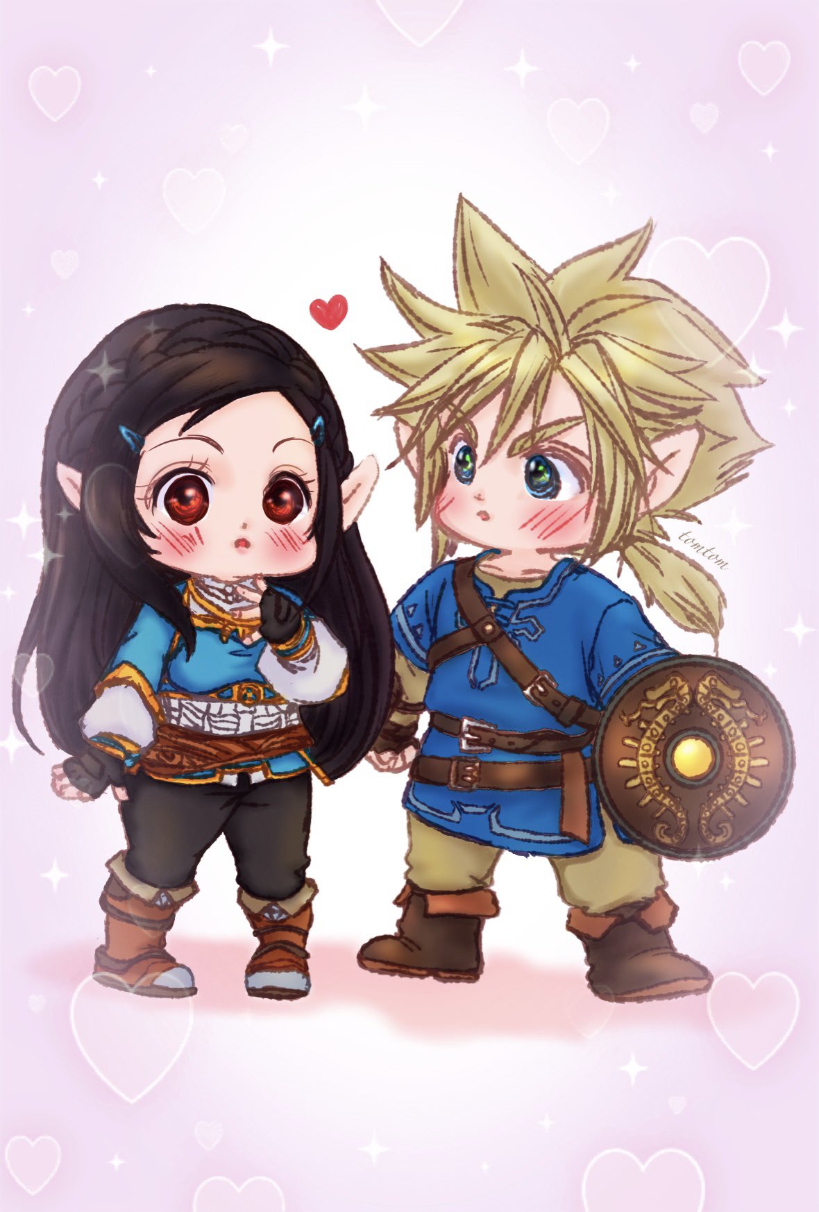 1boy 1girl belt black_hair blonde_hair blue_eyes blush boots breasts brown_footwear chibi cloud_strife cosplay couple final_fantasy final_fantasy_vii fingerless_gloves full_body gloves hair_ornament hairclip heart highres holding holding_shield link link_(cosplay) long_hair long_sleeves low_ponytail medium_breasts multiple_belts nintendo pointy_ears ponytail princess_zelda princess_zelda_(cosplay) red_eyes shield shirt spiked_hair square_enix the_legend_of_zelda the_legend_of_zelda:_breath_of_the_wild tifa_lockhart tomtom tunic