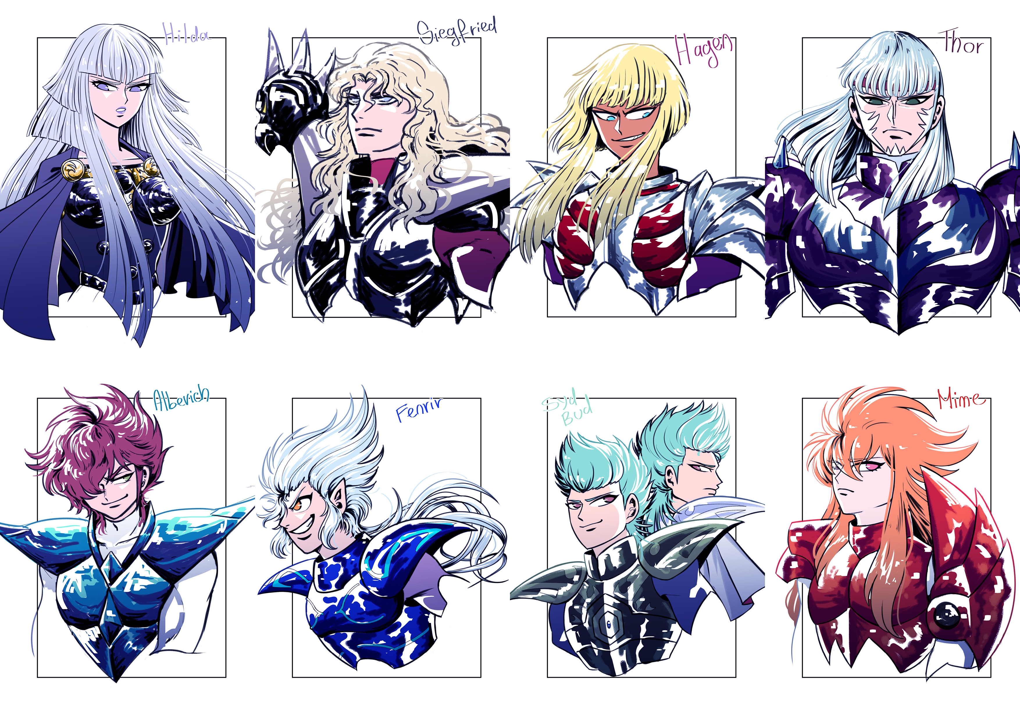 1girl absurdres alcor_zeta_bud alioth_epsilon_fenrir armor benetnasch_eta_mime closed_mouth dubhe_alpha_siegfried hair_between_eyes highres long_hair megrez_delta_alberich merak_beta_hagen mizar_zeta_syd multiple_boys open_mouth phecda_gamma_thor polaris_hilda saint_seiya