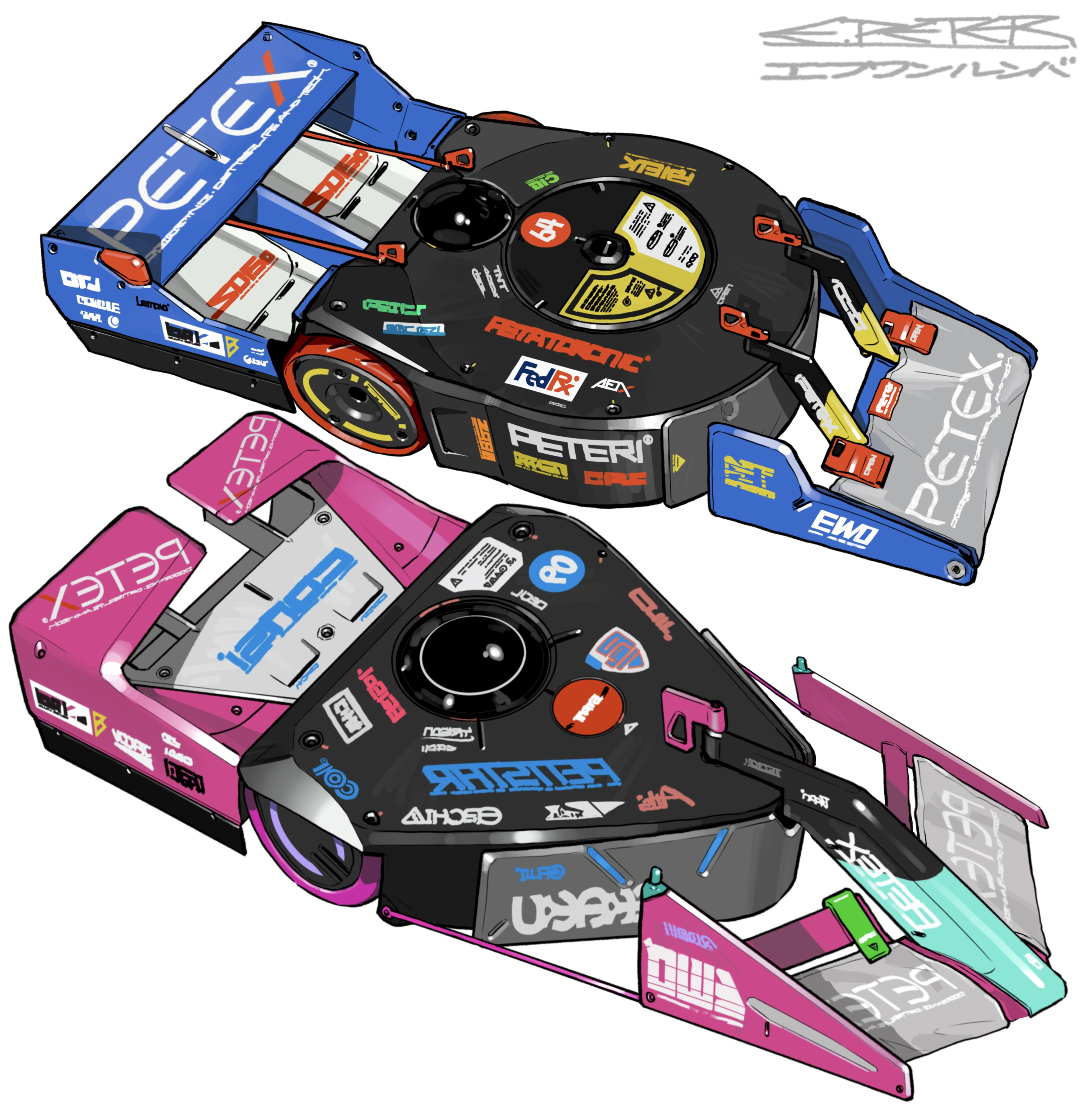absurdres artist_name formula_one from_above highres mundane_made_awesome no_humans parody peter_(peter6409) robotic_vacuum_cleaner simple_background spoiler_(automobile) wheel white_background