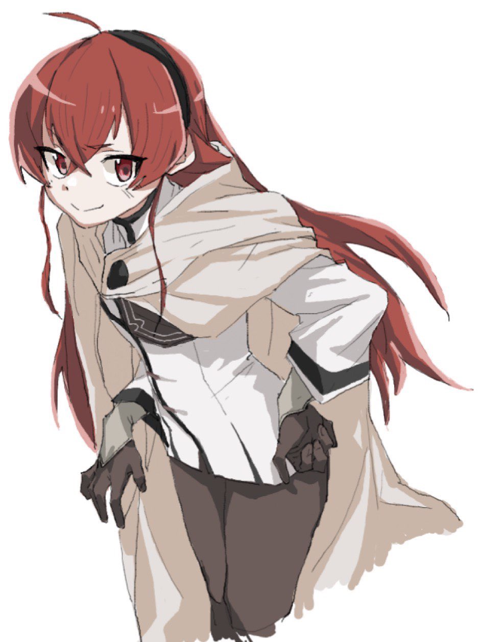1girl eris_greyrat hand_on_own_hip highres leaning_forward mushoku_tensei red_eyes rkgk_ojisan smile solo twitter white_background