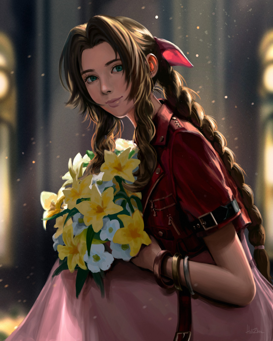 1girl aerith_gainsborough artist_name bangle bouquet bracelet braid braided_ponytail brown_hair church cropped_jacket dress final_fantasy final_fantasy_vii final_fantasy_vii_remake flower green_eyes hair_ribbon holding holding_bouquet hollizho indoors jacket jewelry long_dress long_hair looking_at_viewer parted_bangs pink_dress pink_ribbon red_jacket ribbon short_sleeves sidelocks signature sitting smile solo square_enix wavy_hair white_flower yellow_flower