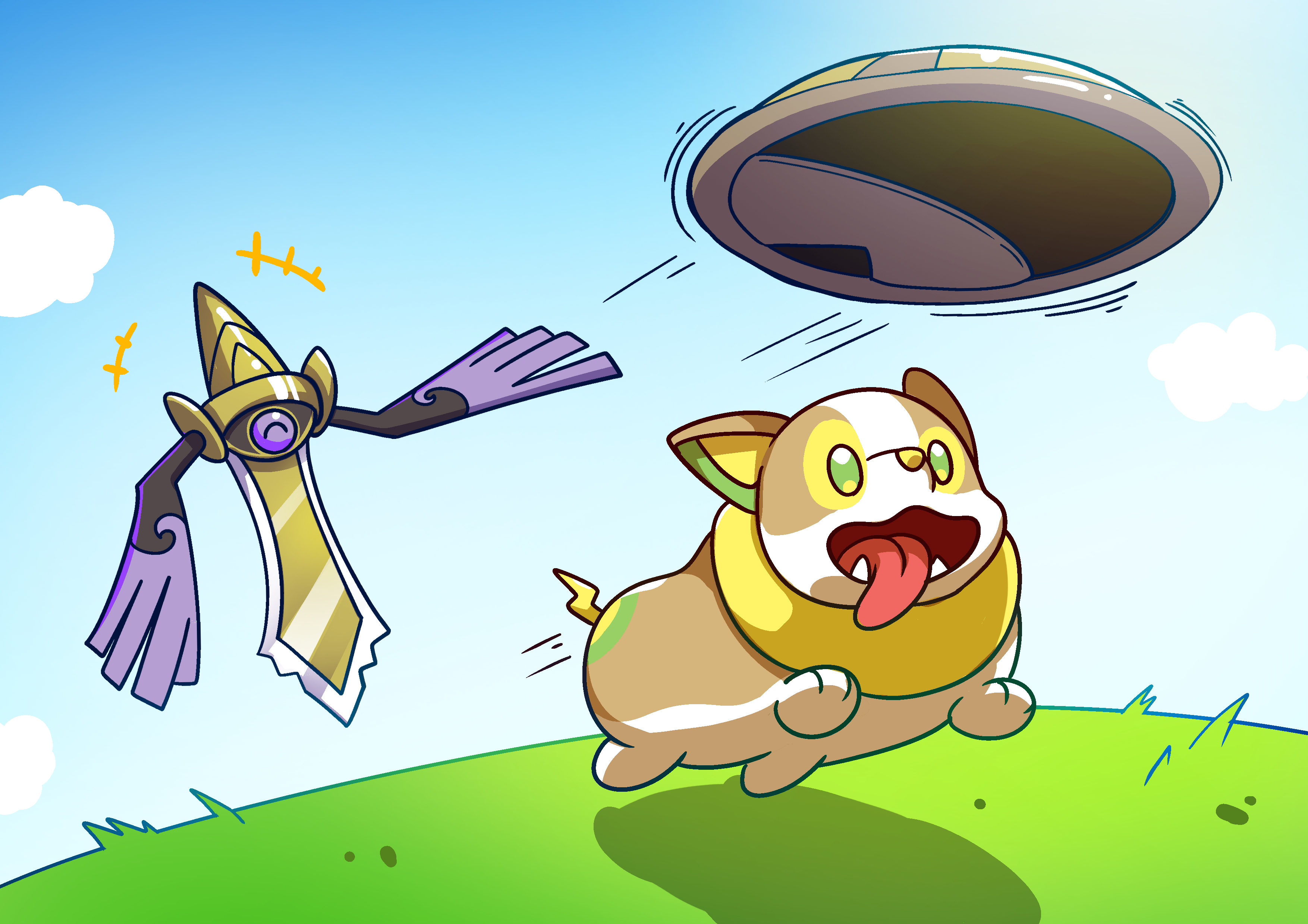 absurdres aegislash blue_sky closed_eyes cloud fangs frisbee fukidashi_cotton gen_6_pokemon gen_8_pokemon grass green_eyes highres motion_lines nintendo no_humans open_mouth pokemon pokemon_(creature) shield sky smile tongue tongue_out yamper