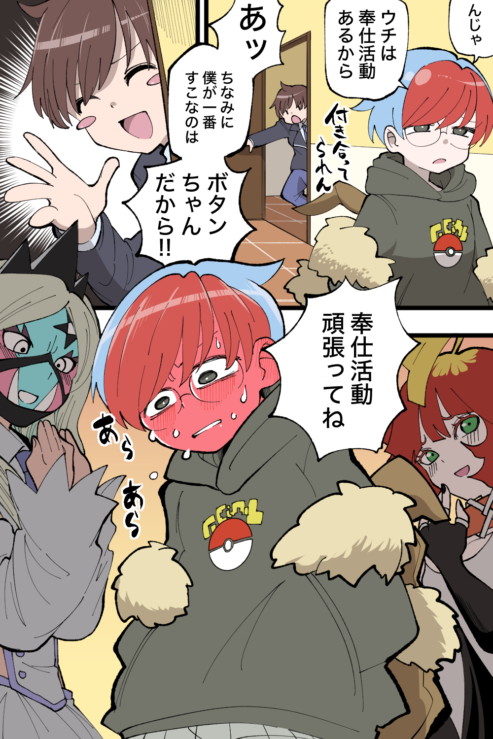 1boy 3girls blue_hair blush brown_hair commentary_request embarrassed eri_(pokemon) florian_(pokemon) glasses green_eyes grey_eyes grey_hair highres mela_(pokemon) multicolored_hair multiple_girls nintendo penny_(pokemon) pokemon pokemon_scarlet_and_violet red_hair round_eyewear samu_(celery18) short_hair smile speech_bubble sweat sweater team_star translation_request