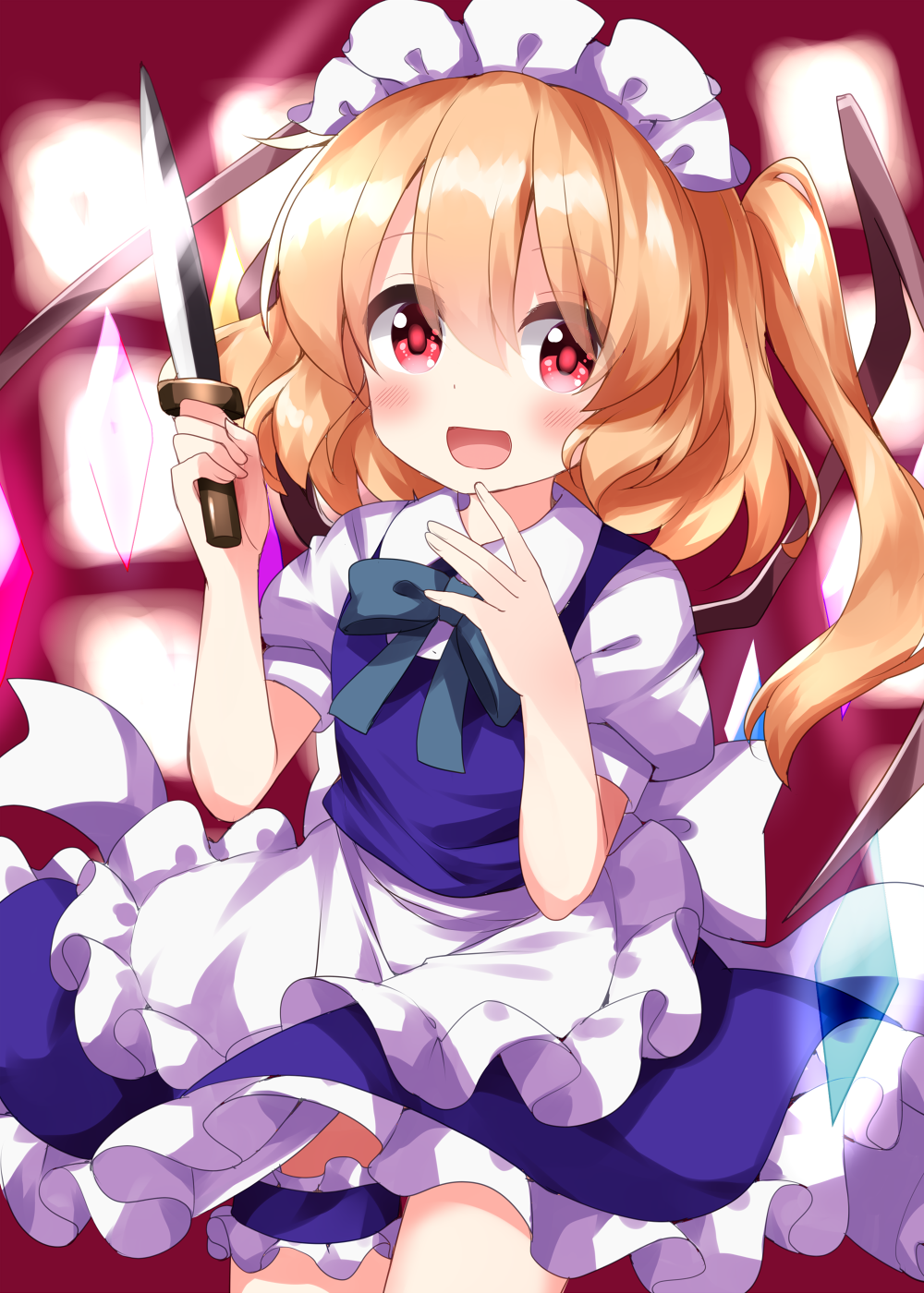 1girl alternate_costume apron blonde_hair blue_dress blush cosplay cowboy_shot crystal dress enmaided flandre_scarlet hair_between_eyes highres holding holding_knife izayoi_sakuya izayoi_sakuya_(cosplay) knife long_hair maid maid_headdress open_mouth puffy_short_sleeves puffy_sleeves red_eyes ruu_(tksymkw) short_sleeves side_ponytail smile solo touhou waist_apron white_apron wings
