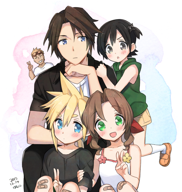 2girls 3boys aerith_gainsborough aged_down artist_name bandaid bandaid_on_knee bandaid_on_leg bare_arms bare_shoulders black_hair black_shirt blonde_hair blue_eyes blush braid braided_ponytail brown_hair child cid_highwind closed_eyes cloud_strife collared_shirt dated final_fantasy final_fantasy_vii final_fantasy_viii flat_chest goggles goggles_on_head green_eyes green_hoodie grey_eyes grin hair_between_eyes hair_ribbon half_updo head_on_hand holding_another's_arm hood hood_down hoodie kingdom_hearts krudears long_hair multiple_boys multiple_girls open_mouth orange_shoes parted_bangs parted_lips red_ribbon ribbon shirt shirt_under_shirt shoes short_hair short_sleeves shorts shuriken_hair_ornament side_ponytail sidelocks sleeveless sleeveless_hoodie sleeveless_shirt smile socks spaghetti_strap squall_leonhart t-shirt teeth upper_body v v-shaped_eyebrows wavy_hair white_shirt white_socks yellow_shorts yuffie_kisaragi