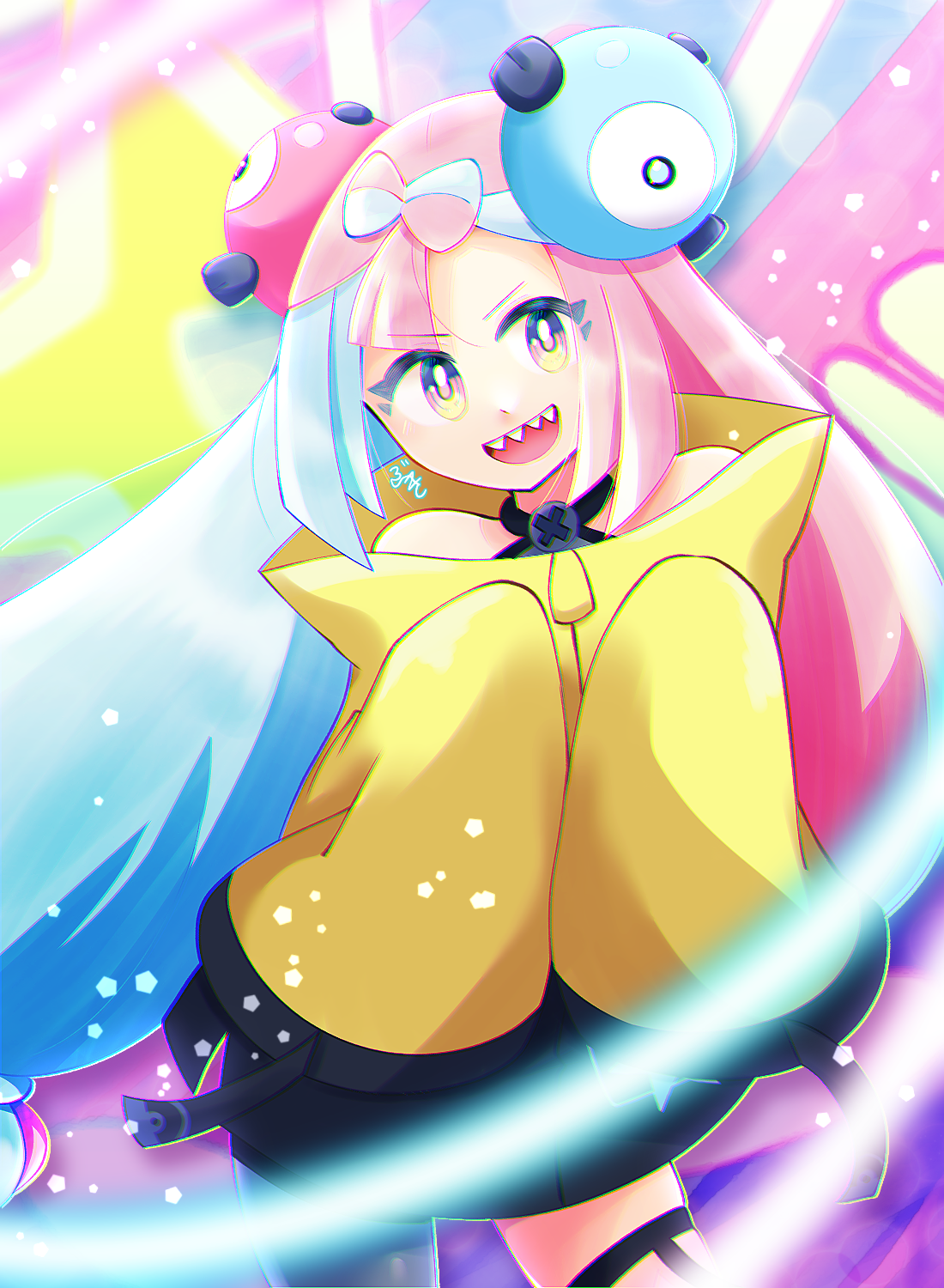 1girl bow-shaped_hair character_hair_ornament dlllll_lllllb grey_pantyhose hair_ornament hexagon_print highres iono_(pokemon) jacket long_hair long_sleeves low-tied_long_hair multicolored_hair nintendo oversized_clothes pantyhose pokemon pokemon_sv sharp_teeth single_leg_pantyhose sleeves_past_fingers sleeves_past_wrists solo split-color_hair teeth x_(symbol) yellow_jacket