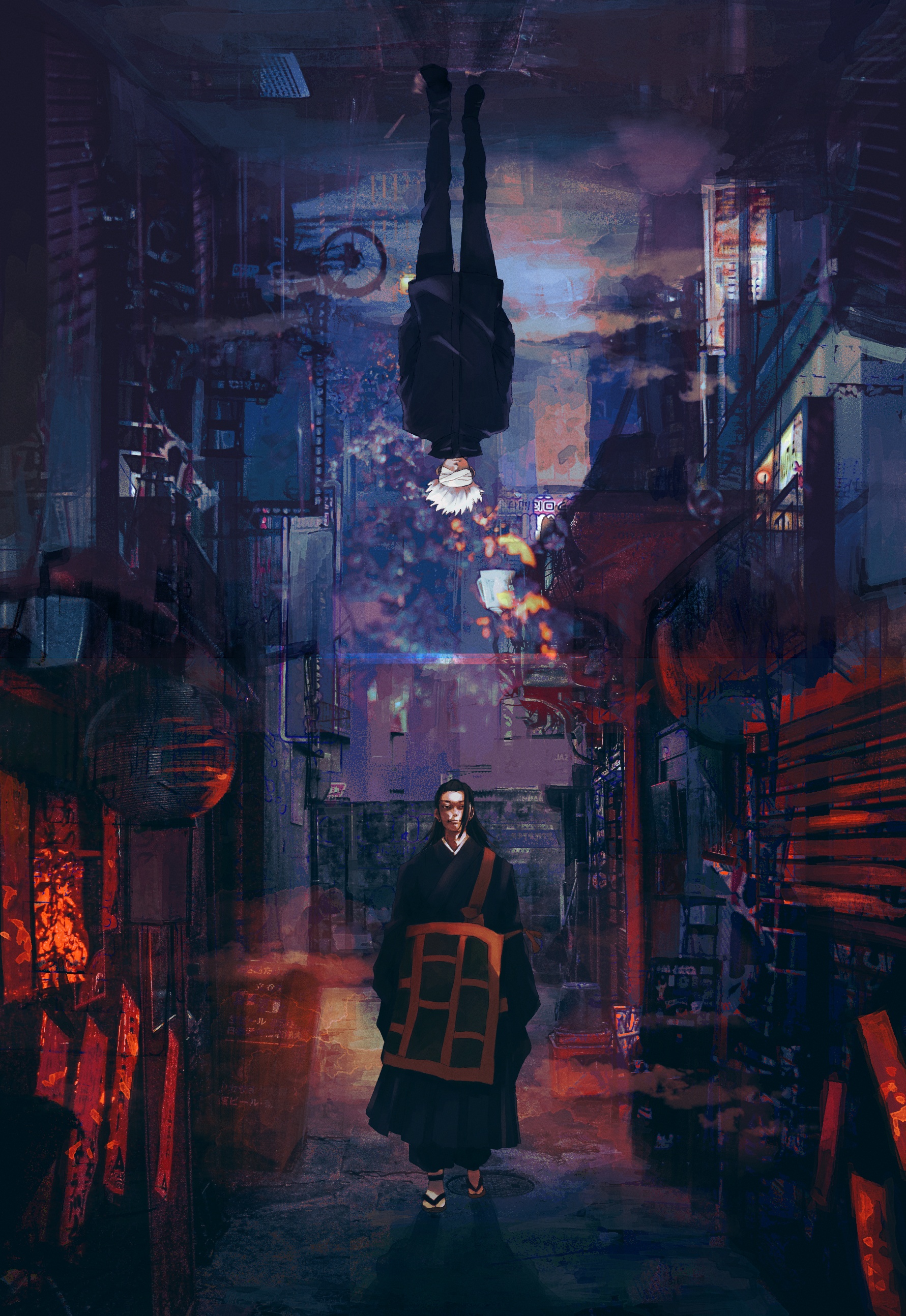 2boys absurdres alley bandages bandages_over_eyes bicycle black_hair black_jacket black_robe city_lights cityscape dark_background facing_viewer geta geto_suguru gojo_satoru highres jacket jujutsu_kaisen jujutsu_tech_uniform key2_0209 long_hair looking_at_viewer multiple_boys polar_opposites robe short_hair single_sidelock spiked_hair upside-down white_hair