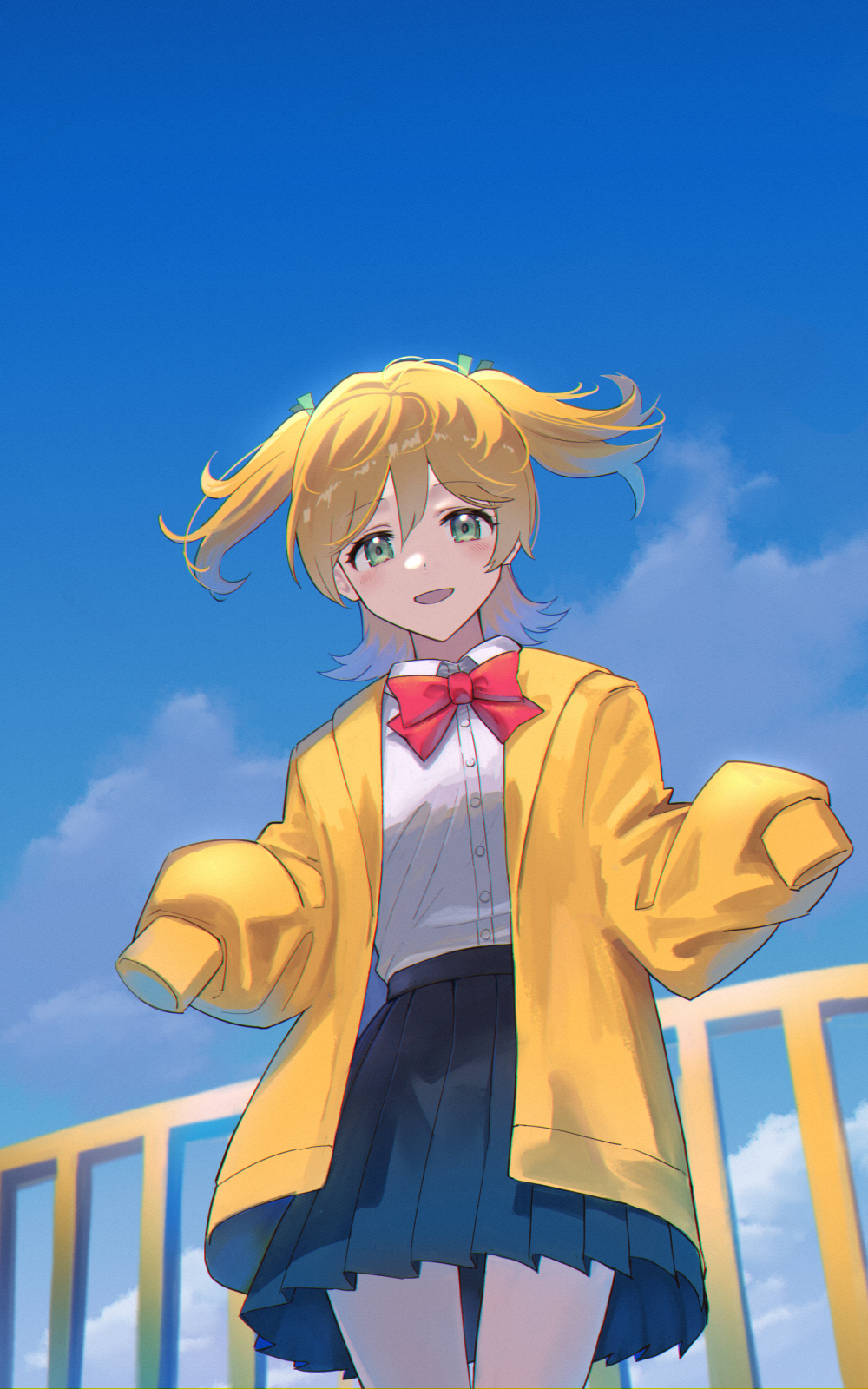 1girl black_skirt blonde_hair blue_sky blurry blurry_background blush bow bowtie buttons cloud collared_shirt commentary cowboy_shot daiba_nana day english_commentary floating_hair from_below green_eyes green_ribbon hair_between_eyes hair_ribbon hands_up high-waist_skirt highres jacket kooan long_sleeves looking_at_viewer looking_down miniskirt open_clothes open_jacket outdoors parted_lips pleated_skirt railing red_bow red_bowtie ribbon school_uniform seishou_music_academy_uniform shirt short_hair short_twintails shoujo_kageki_revue_starlight skirt sky sleeves_past_fingers sleeves_past_wrists smile solo standing twintails white_shirt yellow_jacket