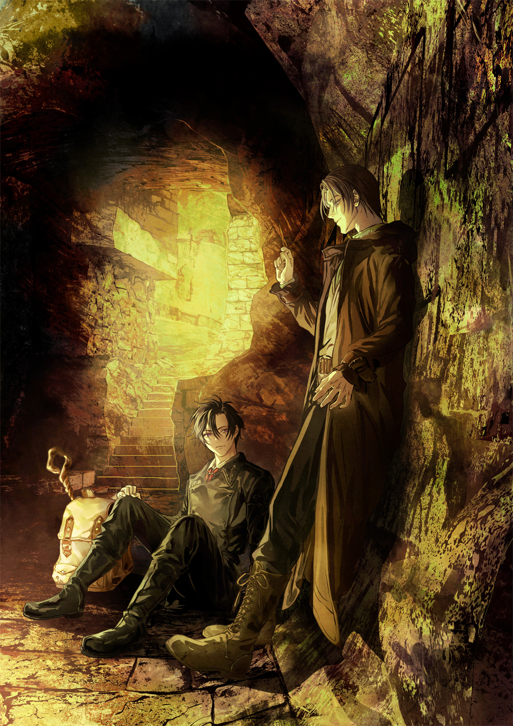 2boys against_wall backpack bag belt black_coat black_footwear black_pants boots coat hair_between_eyes hand_on_own_knee hand_up highres hugo_hans leaning long_sleeves multiple_boys panmijin99 pants pixiv_fantasia pixiv_fantasia_scepter_of_zeraldia short_hair sitting stairs standing unworn_backpack unworn_bag visk_hazen