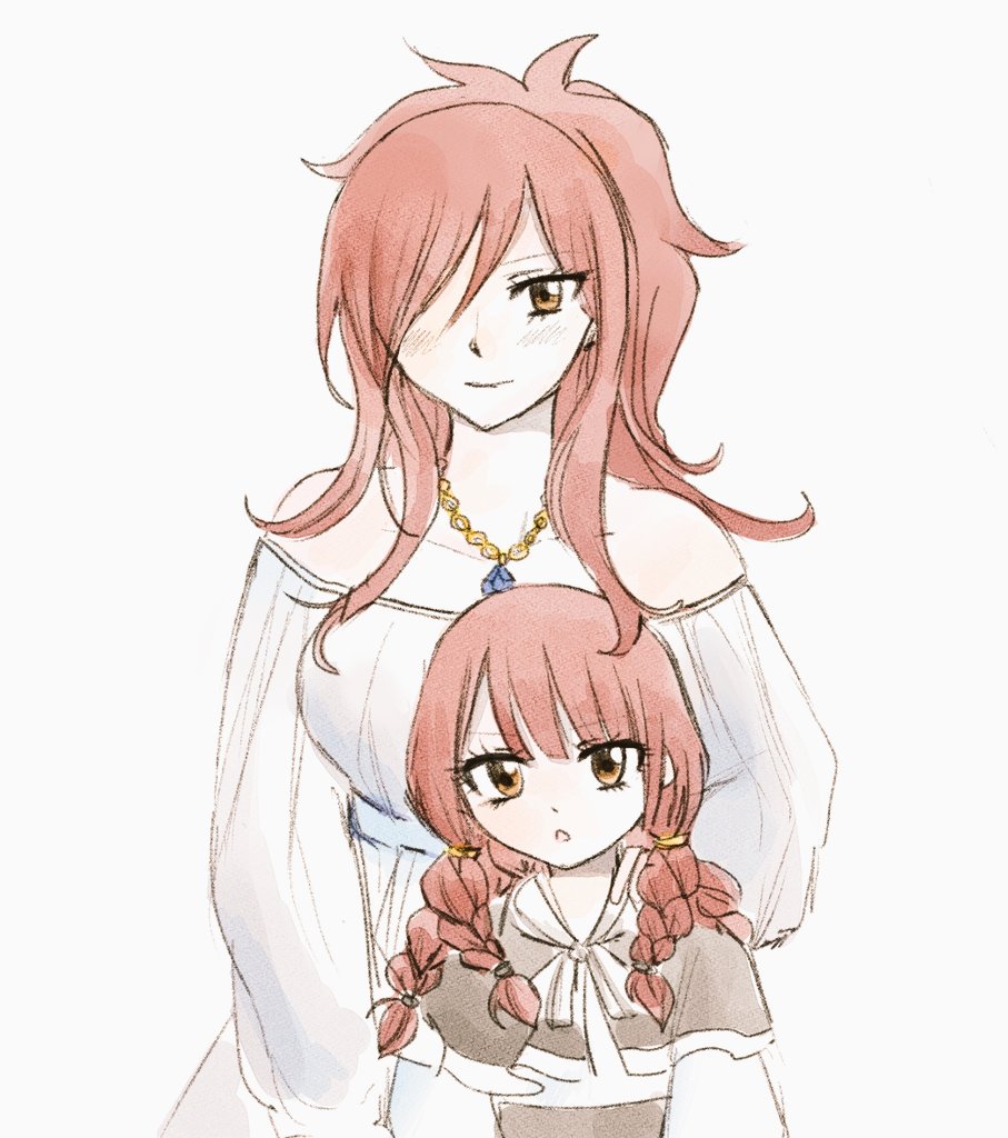 2girls bare_shoulders erza_knightwalker fairy_tail hair_over_one_eye irene_belserion jewelry long_hair looking_at_viewer mother_and_child mother_and_daughter multiple_girls necklace parent_and_child quad_braids red_hair reincarnation