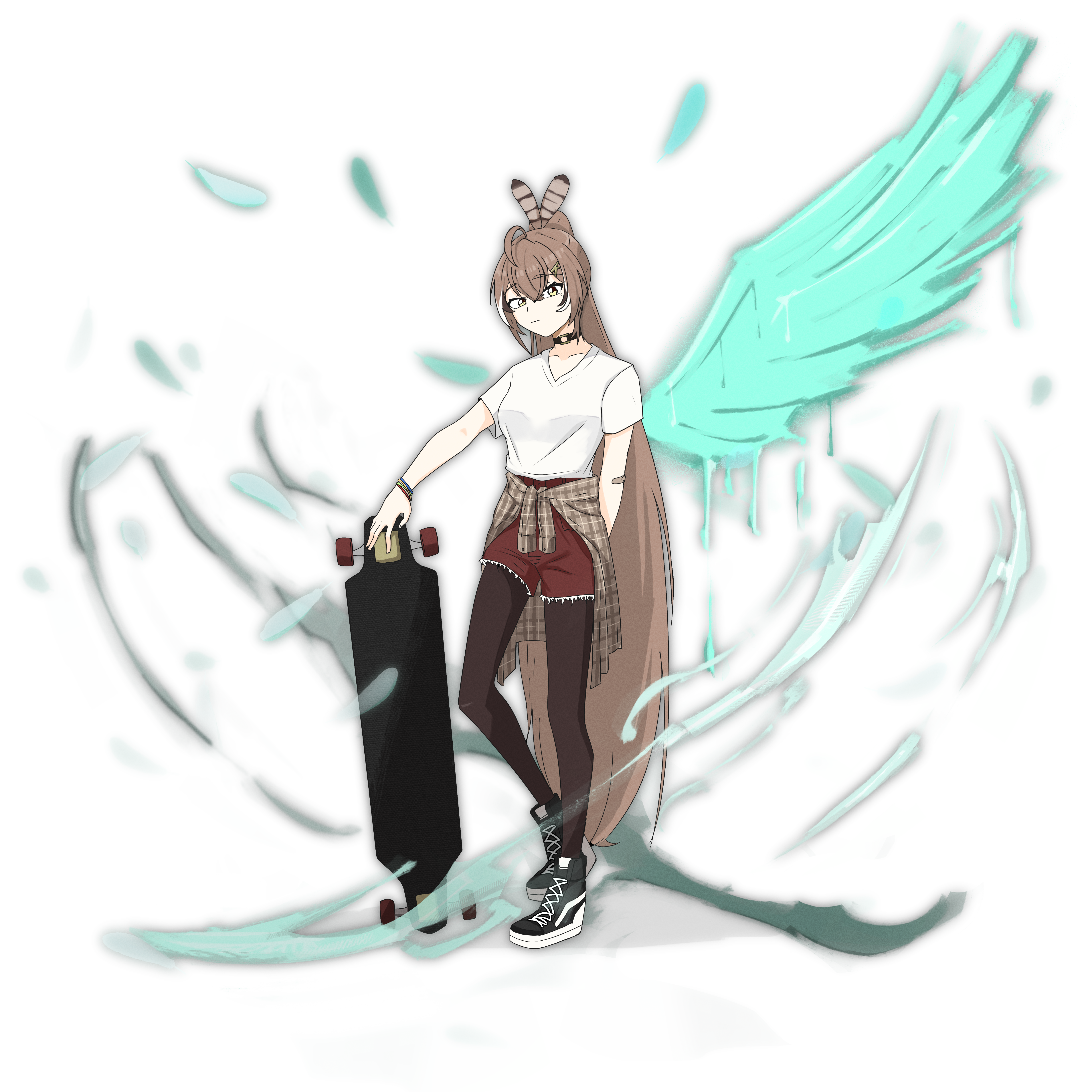 1girl absurdres arm_behind_back bandaid bandaid_on_arm breasts brown_eyes brown_hair choker clothes_around_waist feather_hair_ornament feathers full_body hair_ornament highres hololive hololive_english pantyhose_under_shorts long_hair longboard medium_breasts nanashi_mumei o-ring o-ring_choker pantyhose ponytail red_shorts saruissaart shirt shirt_around_waist shoes shorts single_wing skateboard sneakers solo t-shirt very_long_hair virtual_youtuber wings wristband