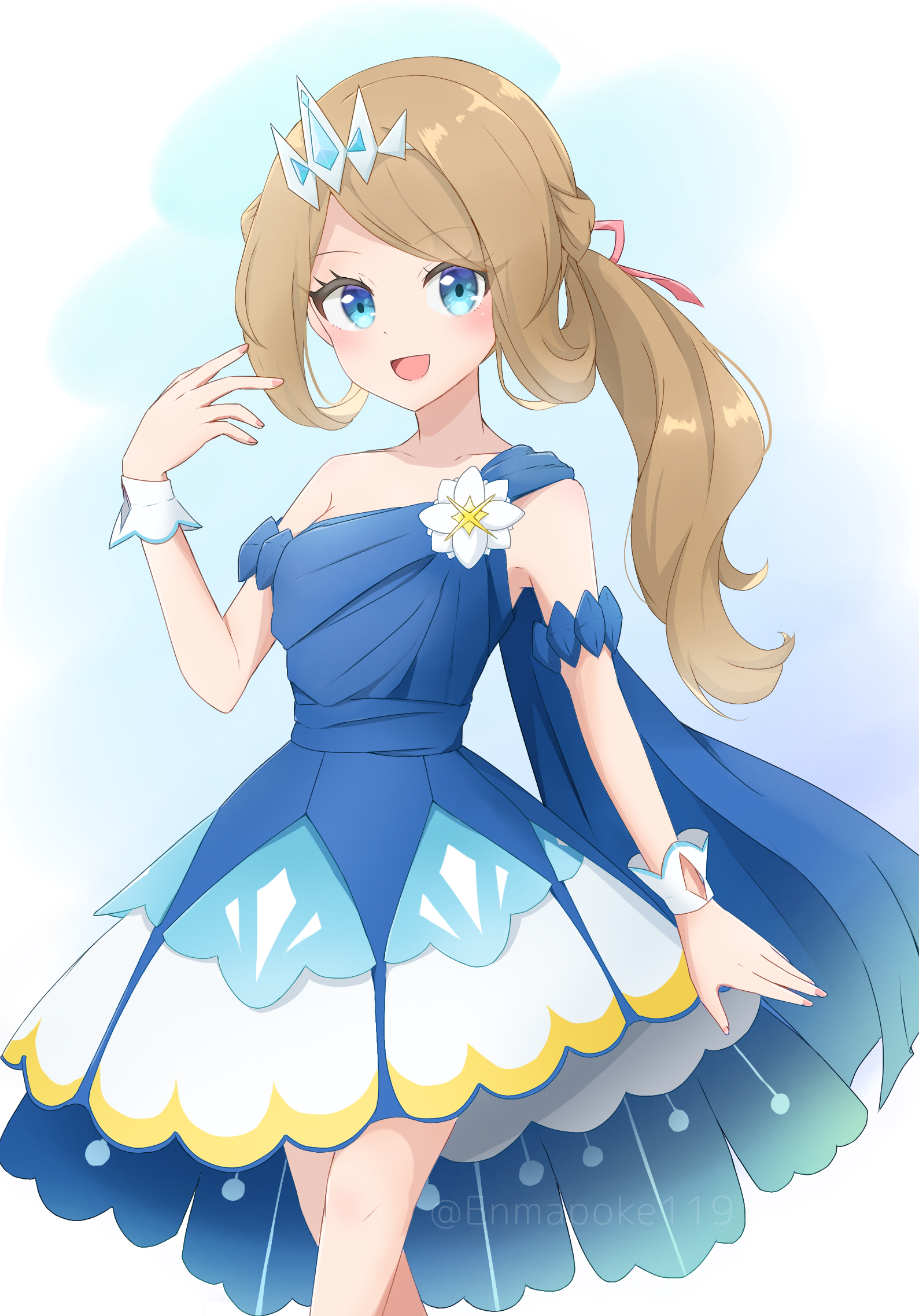 1girl :d blonde_hair blue_dress blue_eyes blush commentary_request dress eyelashes flower hair_ribbon hand_up highres long_hair looking_at_viewer nintendo official_alternate_costume open_mouth pink_ribbon pokemon pokemon_masters_ex ponytail ribbon sakura_enma serena_(champion)_(pokemon) serena_(pokemon) single_strap smile solo tiara watermark white_flower wrist_cuffs