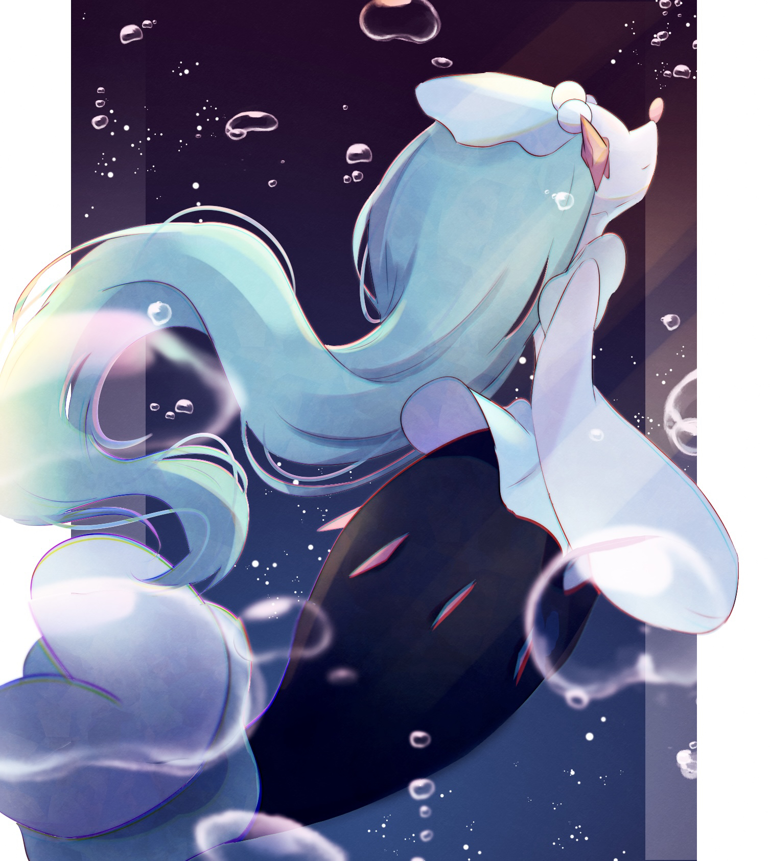 air_bubble blurry bubble closed_mouth commentary from_side gen_7_pokemon green_hair highres long_hair nintendo no_humans pillarboxed pio_(piopio_poke) pokemon pokemon_(creature) primarina solo underwater