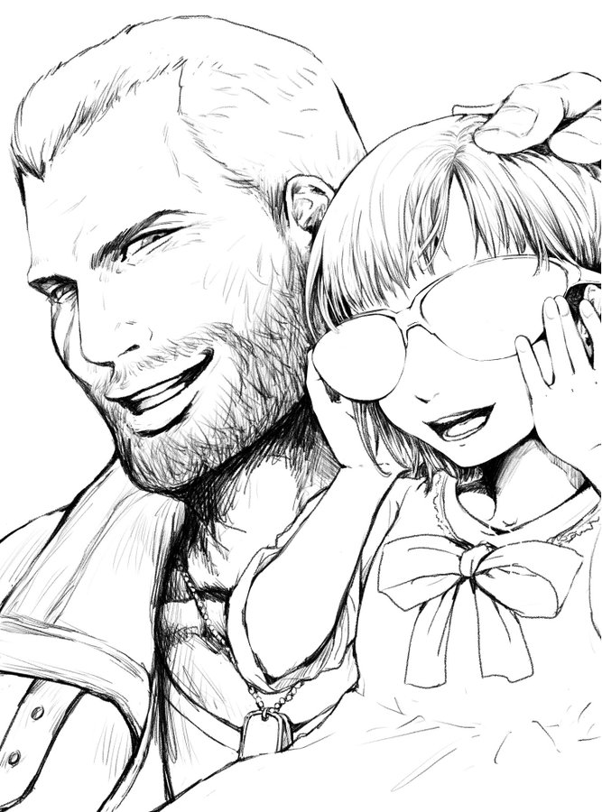 1boy 1girl amemori_0207 barret_wallace beard bow bowtie child dog_tags facial_hair father_and_child father_and_daughter final_fantasy final_fantasy_vii final_fantasy_vii_remake glasses hand_on_another's_head lineart marlene_wallace open_mouth parent_and_child scar scar_on_face short_hair short_sleeves smile square_enix upper_body very_short_hair vest white_background