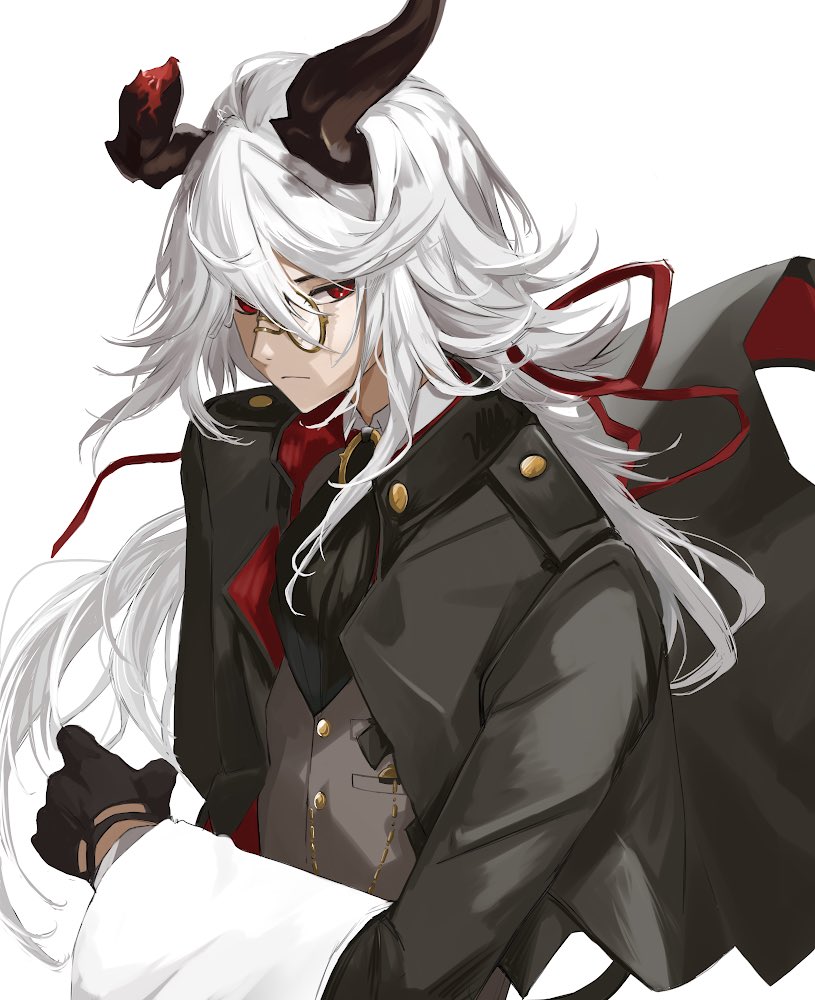 1boy alchemy_stars ascot black_ascot black_gloves black_jacket broken_horn closed_mouth collared_shirt frown gloves grey_vest horns jacket long_hair long_sleeves looking_at_viewer male_focus minos_(alchemy_stars) monocle open_clothes open_jacket red_eyes shirt simple_background solo towel upper_body vest white_background white_hair zarameru_jisosaku
