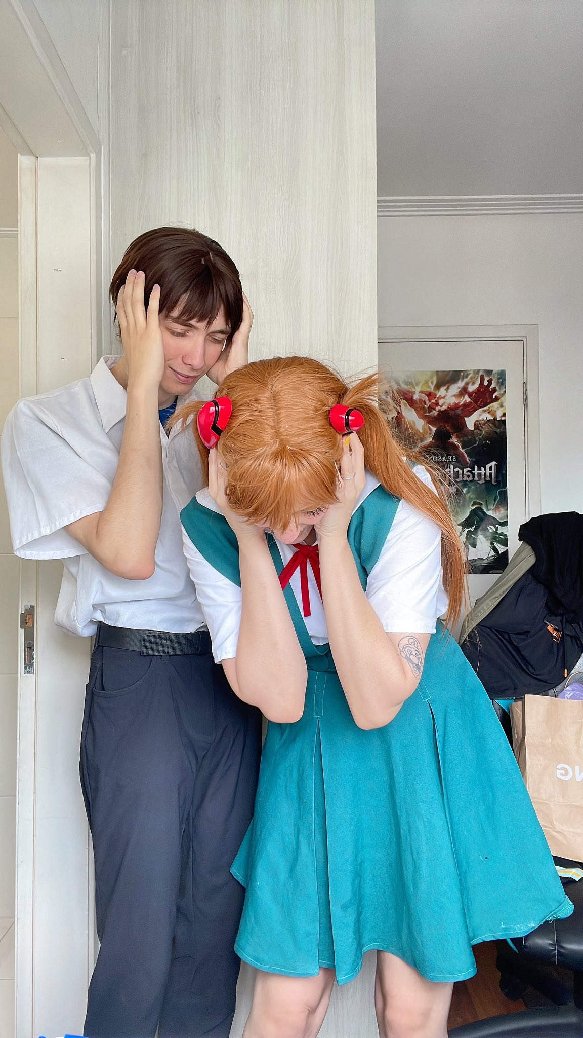 1boy 1girl brazilian_(nationality) brown_hair cosplay covering_face hairpods highres ikari_shinji ikari_shinji_(cosplay) interface_headset_(evangelion) lips memepantazis neon_genesis_evangelion photo_(medium) photo_(object) souryuu_asuka_langley souryuu_asuka_langley_(cosplay) standing twintails two_side_up