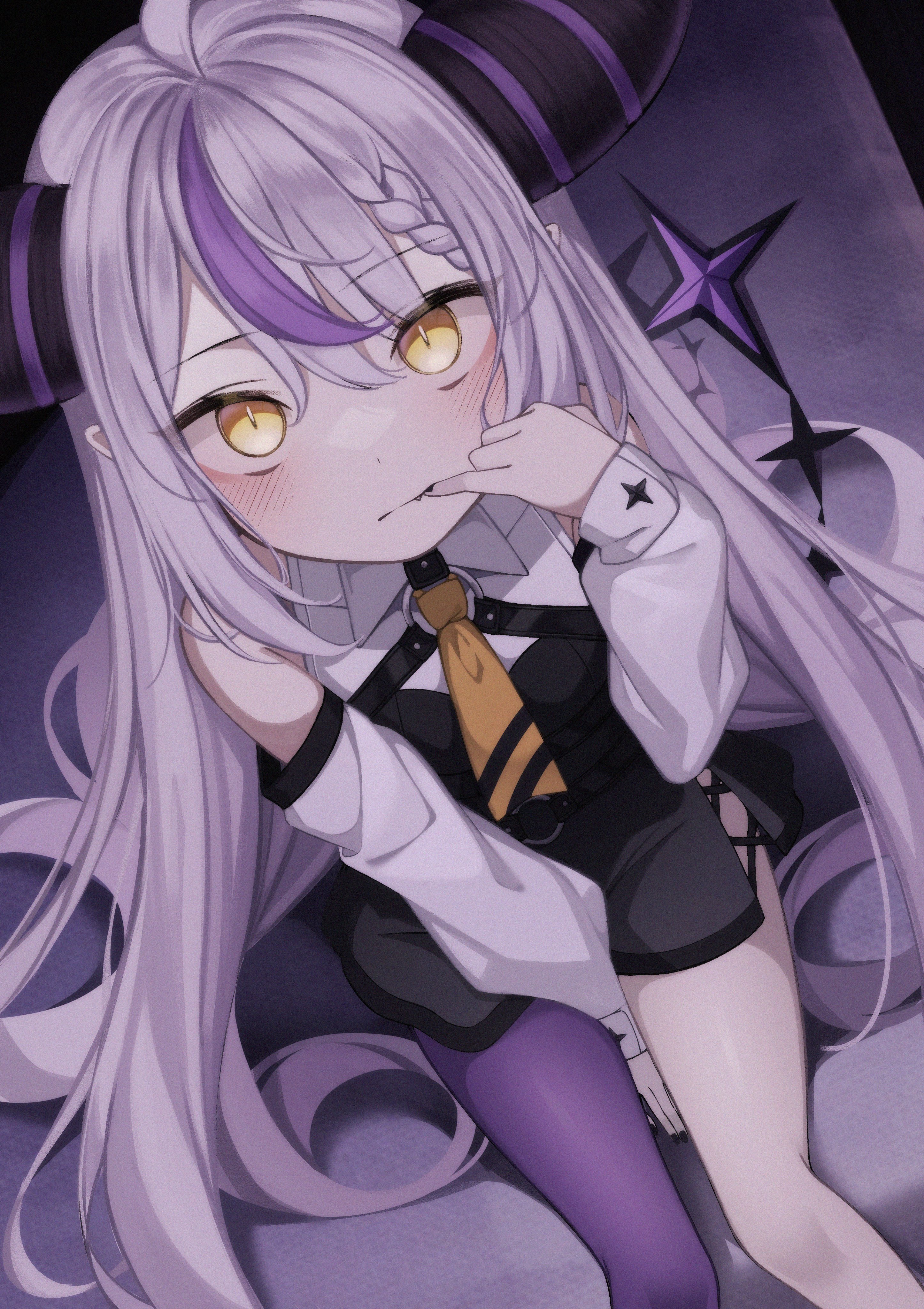 1girl absurdres blush braid detached_sleeves fang fang_out highres hololive horns karou_(lhscck302) la+_darknesss long_hair looking_at_viewer multicolored_hair necktie pointy_ears purple_hair purple_thighhighs single_thighhigh sitting solo tail thighhighs two-tone_hair virtual_youtuber yellow_eyes