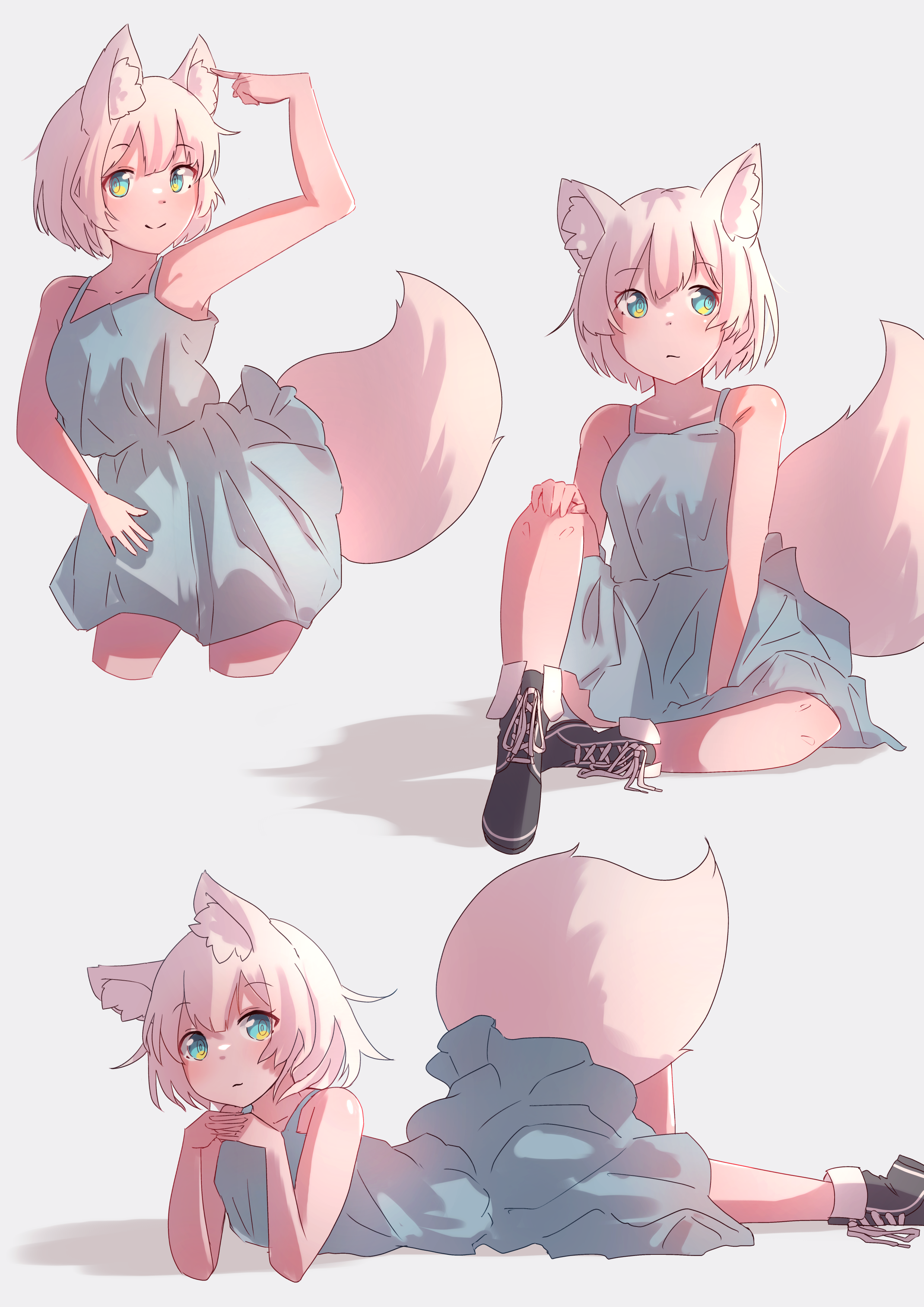 1girl absurdres animal_ear_fluff animal_ears arm_up armpits between_legs black_footwear blue_dress boots closed_mouth clothes_lift collarbone dress dress_lift fox_ears fox_girl fox_tail green_eyes hair_between_eyes hand_between_legs hand_on_own_hip hand_on_own_knee head_rest highres kotatsune lifted_by_tail looking_at_viewer lying medium_dress medium_hair multiple_views on_stomach original simple_background sitting smile spaghetti_strap standing tail tail_raised white_hair