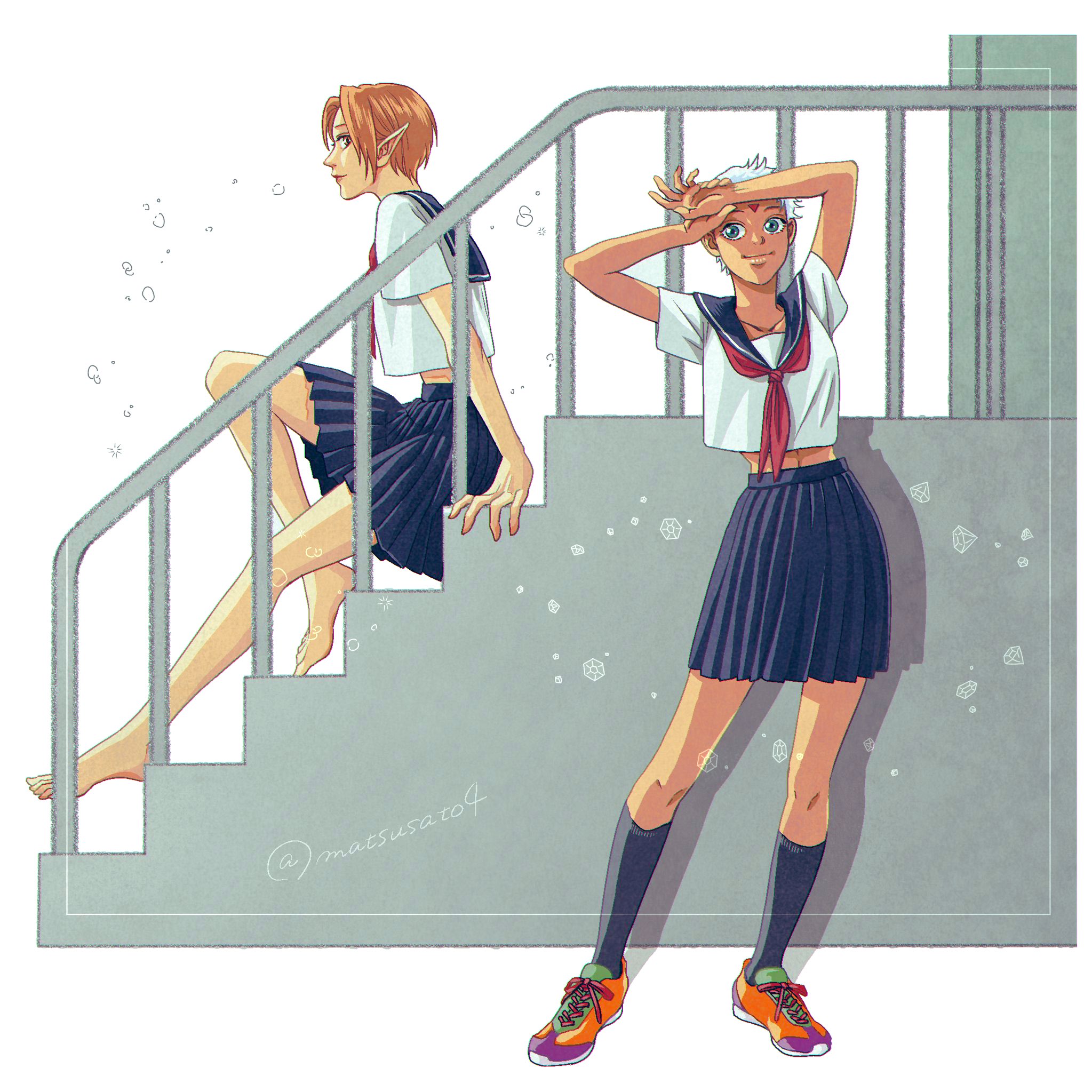 2girls barefoot blue_eyes brown_hair closed_mouth dark-skinned_female dark_skin elf facial_mark forehead_mark full_body gensou_suikoden gensou_suikoden_iv highres jewel_(suikoden) looking_at_viewer multiple_girls paula_(suikoden) pointy_ears satoko_matsumoto school_uniform short_hair smile