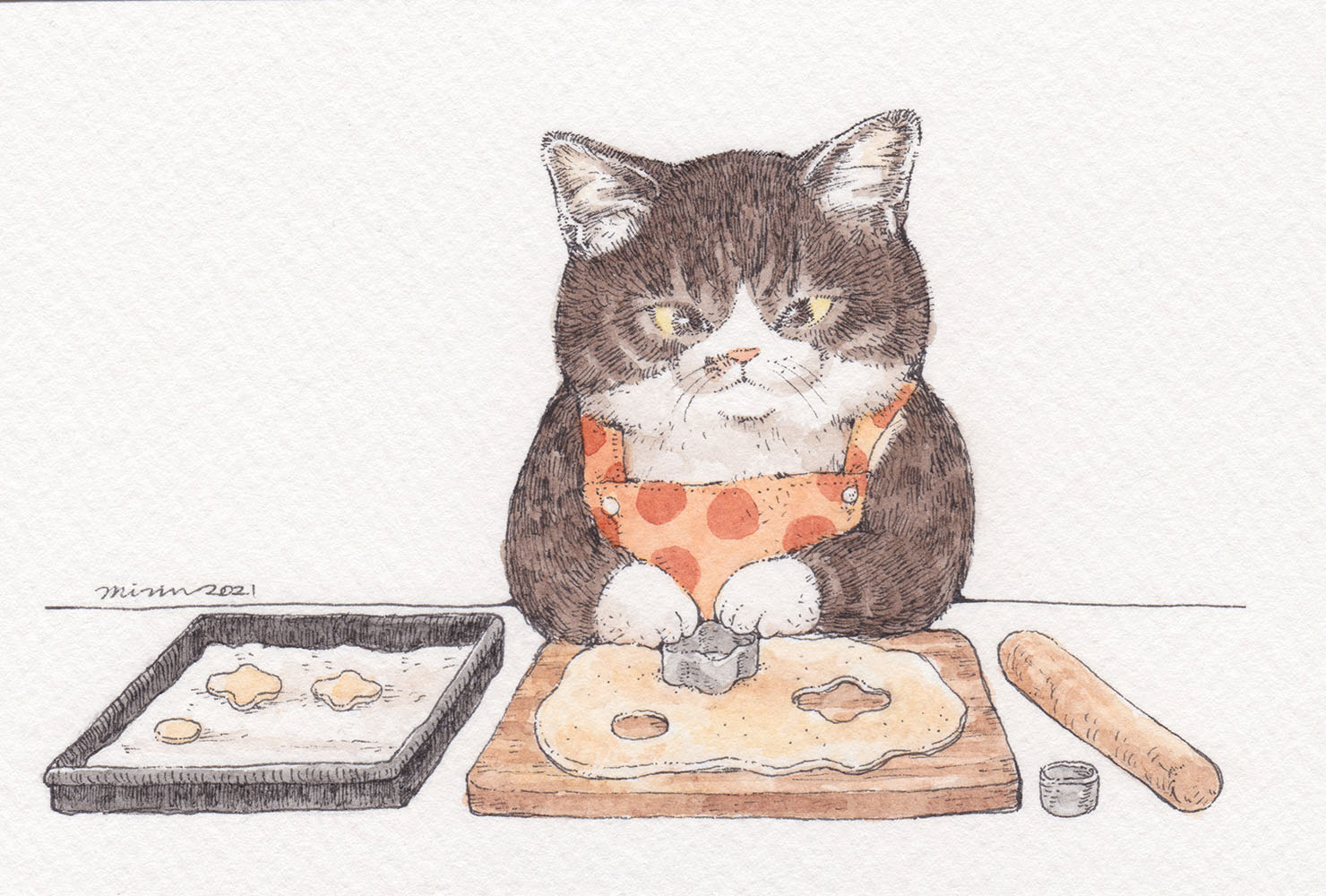 animal_focus apron cat commentary_request cookie_cutter cooking dough mirin_(mirin_4) no_humans original painting_(medium) rolling_pin table traditional_media watercolor_(medium)