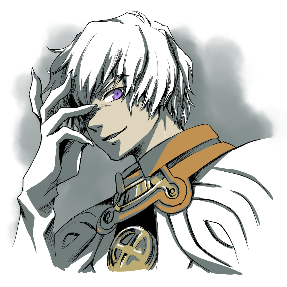 1boy :d bare_shoulders coat copyright_request gloves long_sleeves looking_at_viewer open_mouth oto_nagi purple_eyes short_hair simple_background smile solo upper_body white_background white_coat white_gloves white_hair
