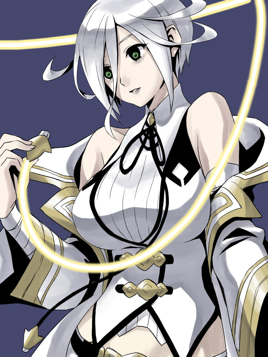 1girl bare_shoulders breasts coat copyright_request green_eyes highres jacket large_breasts long_sleeves open_clothes open_coat oto_nagi parted_lips purple_background short_hair sleeveless sleeveless_jacket solo symbol-shaped_pupils upper_body white_coat white_hair white_jacket