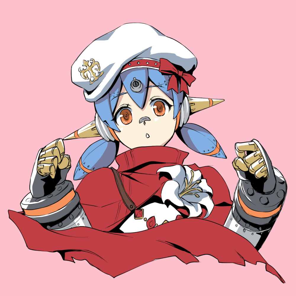1girl android beret blue_hair bow hat long_hair looking_at_viewer open_mouth oto_nagi pink_background poppi_(xenoblade) poppi_alpha_(xenoblade) red_bow red_scarf scarf simple_background solo triangle_mouth twintails upper_body white_hat xenoblade_chronicles_(series) xenoblade_chronicles_2
