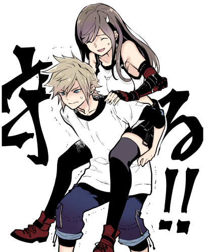 ! !! 1boy 1girl age_difference aged_down arm_guards bare_shoulders black_gloves black_skirt black_thighhighs blonde_hair blue_eyes blue_shorts boots breasts brown_hair carrying child closed_eyes cloud_strife collarbone crop_top earrings elbow_gloves final_fantasy final_fantasy_vii final_fantasy_vii_remake fingerless_gloves gloves jewelry large_breasts long_hair lowres mono0805 open_mouth piggyback red_footwear shirt shorts skirt spiked_hair t-shirt tank_top thighhighs tifa_lockhart trembling undershirt white_background white_tank_top