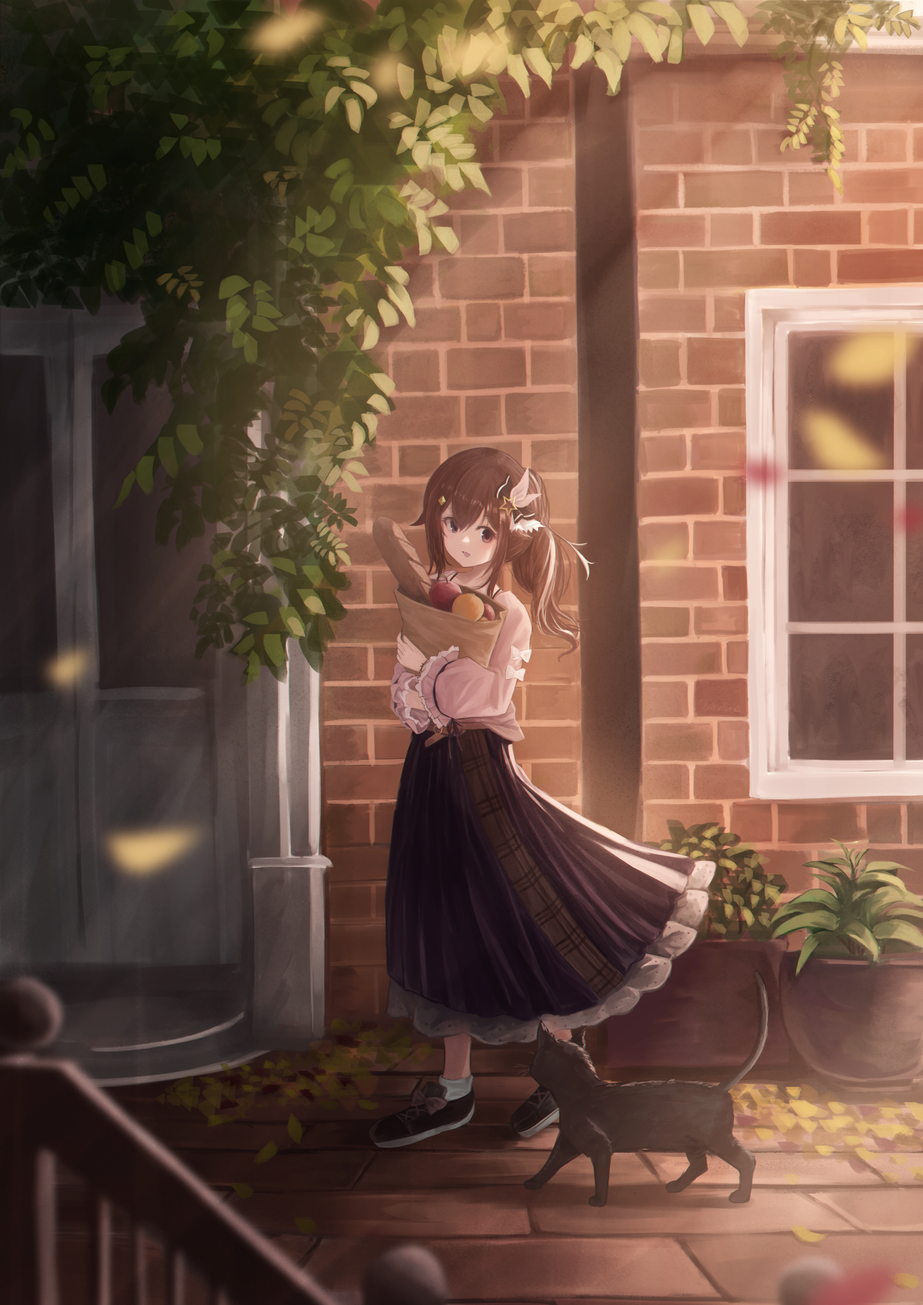 1girl absurdres apple bag baguette black_bow black_cat black_shoes black_skirt bow bread brown_hair cat day food fruit grocery_bag hair_bow hair_ornament hairclip highres hololive house long_hair long_sleeves outdoors plant potted_plant shoes shopping_bag siruru0503 skirt star_(symbol) star_hair_ornament tokino_sora tokino_sora_(casual) virtual_youtuber white_bow window