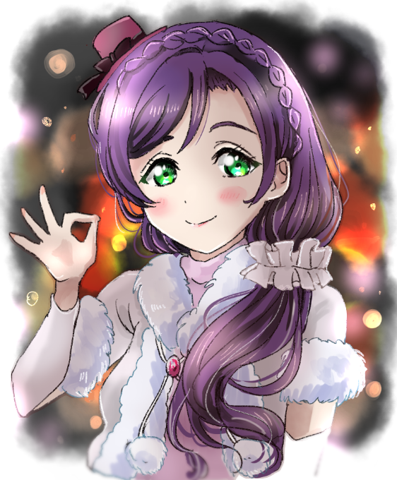 blush closed_mouth fur-trimmed_jacket fur-trimmed_sleeves fur_trim green_eyes hair_ornament hair_scrunchie jacket lipstick long_hair long_sleeves love_live! love_live!_school_idol_project low_twintails makeup parted_bangs purple_hair scrunchie shoc0s smile snow_halation swept_bangs tojo_nozomi twintails upper_body