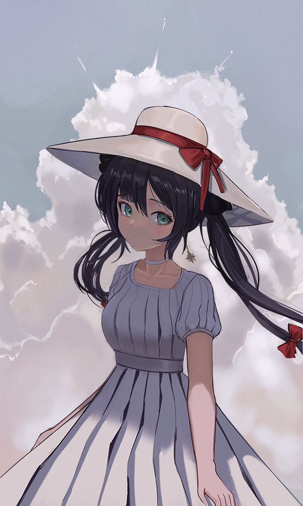 1girl black_bow bow choker closed_mouth cloud cloudy_sky dress genshin_impact green_eyes hat hat_ribbon looking_at_viewer mona_(genshin_impact) moth1 puffy_short_sleeves puffy_sleeves purple_hair red_bow red_ribbon ribbon short_sleeves sky solo straw_hat upper_body white_choker white_dress