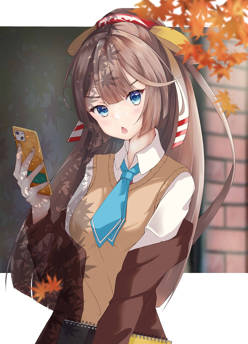 1girl alternate_costume asymmetrical_bangs autumn_leaves blue_eyes blue_necktie blurry blurry_background blurry_foreground brick_wall brown_jacket brown_sweater_vest collared_shirt hair_ribbon high_ponytail holding holding_notebook holding_phone jacket kantai_collection kazagumo_(kancolle) leaf looking_at_viewer maple_leaf necktie notebook off_shoulder open_mouth phone ponytail remimiku ribbon shirt solo sweater_vest white_ribbon white_shirt
