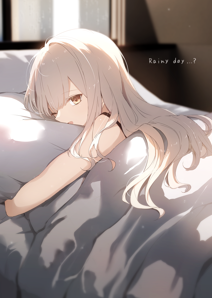 1girl ;d a.a_(aa772) bare_shoulders bed blurry blurry_background brown_eyes brown_hair commentary_request depth_of_field english_text highres indoors long_hair looking_at_viewer lying hugging_object on_stomach one_eye_closed open_mouth original pillow pillow_hug rain sleeveless smile solo under_covers window
