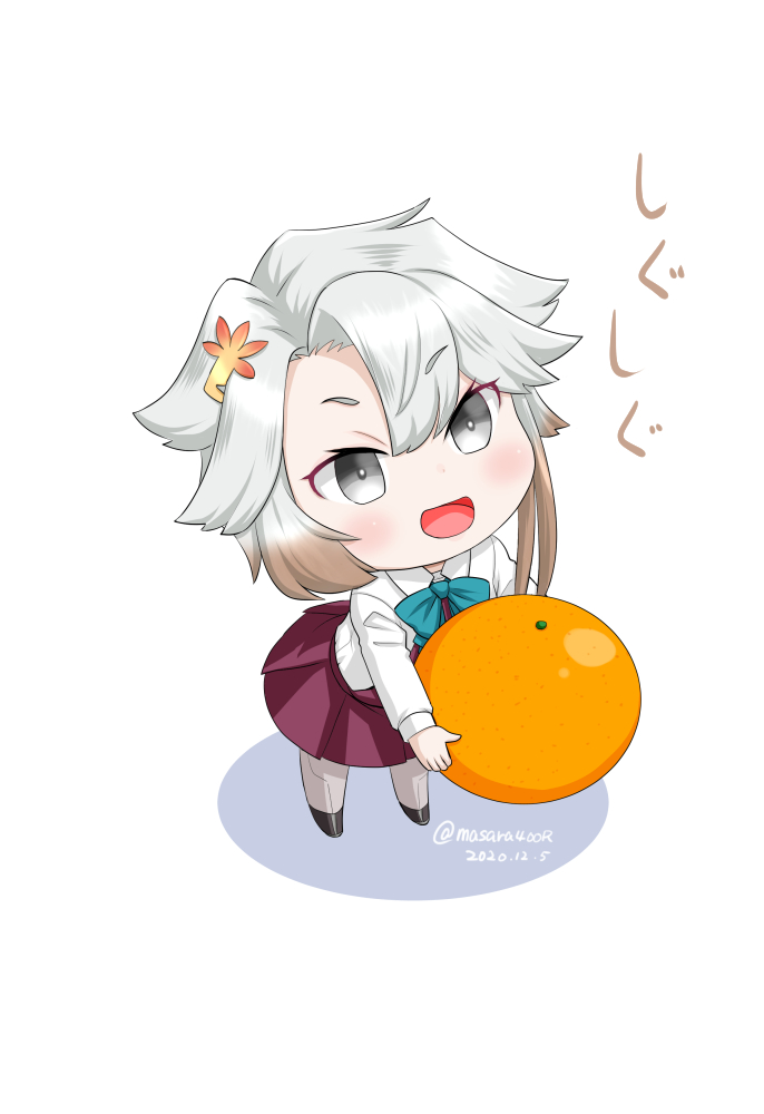 1girl akishimo_(kancolle) aqua_bow aqua_bowtie asymmetrical_bangs asymmetrical_hair bow bowtie brown_hair chibi collared_shirt commentary_request dress dress_shirt food fruit gradient_hair grey_eyes grey_pantyhose hair_ornament halter_dress halterneck holding kantai_collection leaf_hair_ornament leaning_forward long_sleeves mandarin_orange masara_(chuujou) multicolored_hair one-hour_drawing_challenge oversized_object pantyhose pleated_dress purple_dress school_uniform seamed_legwear shirt short_hair short_hair_with_long_locks side-seamed_legwear simple_background smile solo white_background white_shirt