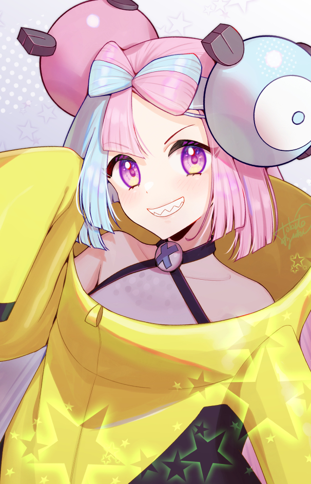 1girl aqua_hair bow-shaped_hair character_hair_ornament hair_ornament hexagon_print iono_(pokemon) jacket long_hair low-tied_long_hair multicolored_hair nintendo pink_hair pokemon pokemon_scarlet_and_violet sharp_teeth solo teeth tokifuji_kougetsu twintails two-tone_hair very_long_hair very_long_sleeves x_(symbol) yellow_jacket