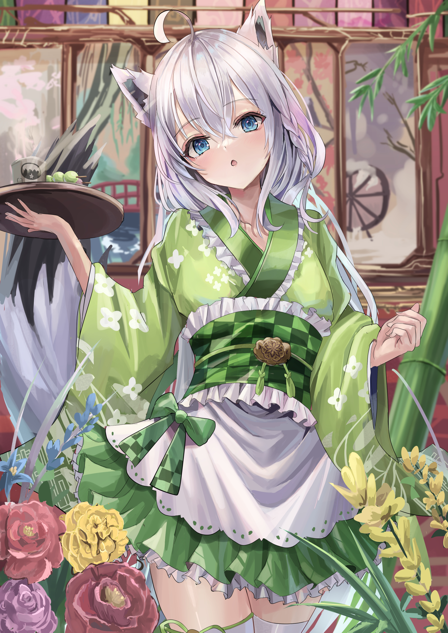 1girl ahoge alternate_costume animal_ear_fluff animal_ears apron bamboo blue_eyes blush bow braid commentary_request cowboy_shot cup enmaided flower fox_ears fox_girl fox_tail frilled_kimono frills green_bow green_kimono hair_between_eyes head_tilt highres holding holding_plate hololive japanese_clothes kimono kimono_skirt long_hair looking_at_viewer maid maid_apron obi obijime open_mouth plate sash shigiroid shirakami_fubuki sidelocks single_braid solo tail thighhighs virtual_youtuber wa_maid white_hair white_thighhighs wide_sleeves yunomi zettai_ryouiki