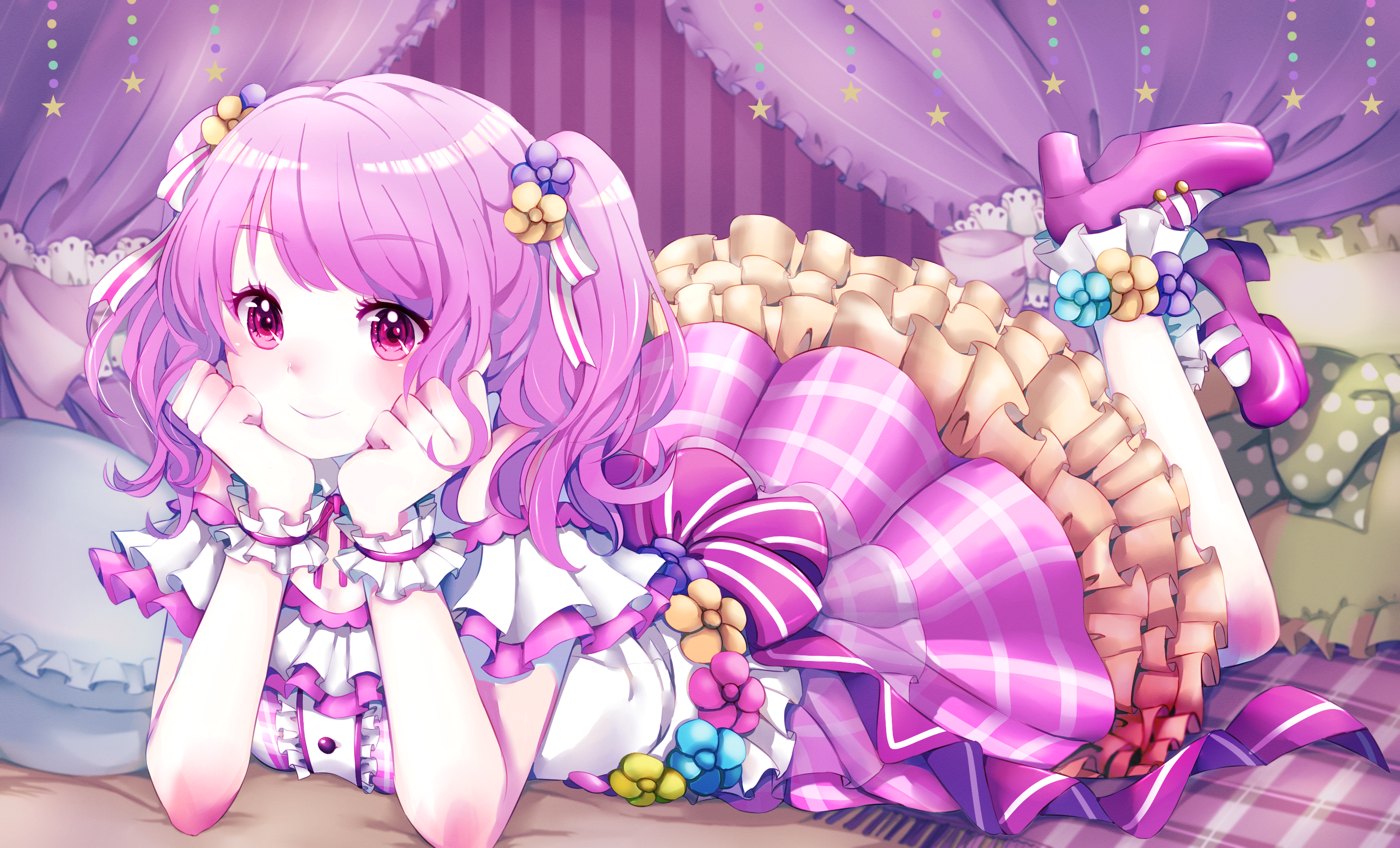 1girl bang_dream! bang_dream!_girls_band_party! blush bow head_rest highres houzuki_ringo long_hair looking_at_viewer lying maruyama_aya on_stomach pastel_palettes_(bang_dream!) pink_eyes pink_hair pink_shoes ribbon shoes smile solo