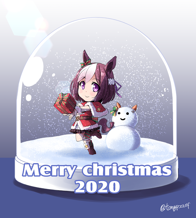 1girl animal_ears black_boots black_skirt bob_cut boots bow brown_hair capelet chibi christmas closed_mouth coat commentary ear_ribbon english_text fur-trimmed_capelet fur-trimmed_coat fur_trim gift hachimaki headband holding holding_gift horse_ears horse_girl horse_tail leg_up looking_at_viewer merry_christmas mini_person minigirl miniskirt multicolored_hair pleated_skirt purple_eyes red_capelet red_coat santa_costume short_hair skirt sleeveless sleeveless_coat smile snow_globe snowing solo special_week_(umamusume) standing standing_on_one_leg star_(symbol) streaked_hair tail tonpuu twitter_username umamusume white_hair white_headband