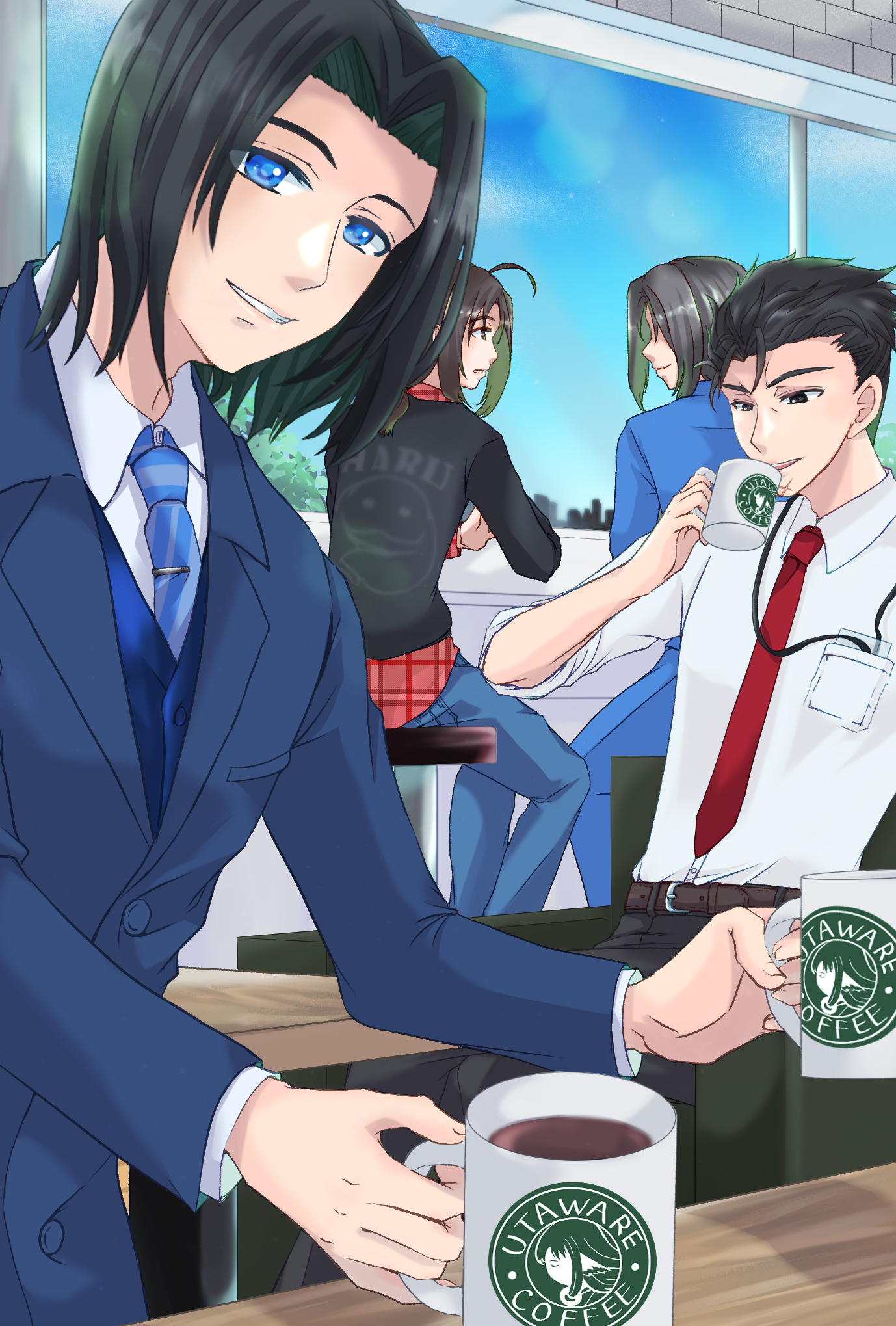 4boys coffee coffee_mug cup formal_clothes haku_(utawarerumono) hakuowlo highres mug multiple_boys starbucks suit ukon_(utawarerumono) utawarerumono