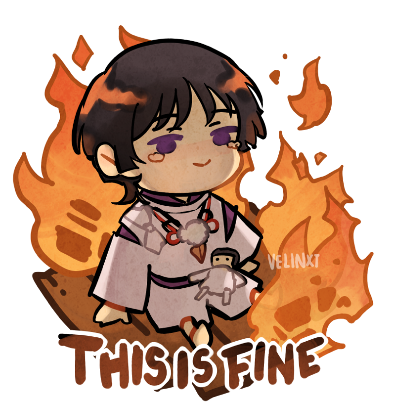 1boy artist_name barefoot black_bow black_hair blush bow chibi closed_mouth commentary detached_sleeves doll english_commentary english_text fire floor genshin_impact gold grey_bow grey_pants grey_vest jewelry leaf long_sleeves looking_at_viewer male_focus mandarin_collar meme necklace missing_headwear official_alternate_costume pants pom_pom_(clothes) purple_eyes purple_shirt red_bow scaramouche_(genshin_impact) scaramouche_(kabukimono)_(genshin_impact) shirt short_hair simple_background sitting smile solo tears this_is_fine_(meme) velinxi vest white_background wide_sleeves